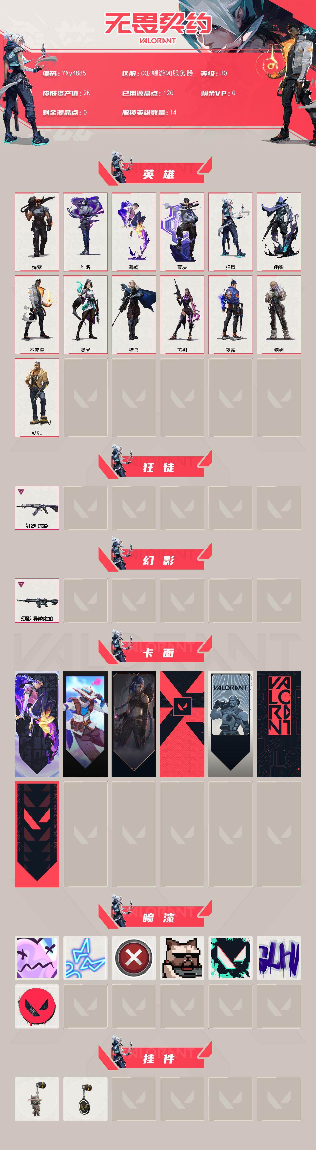 【英雄】:炼狱,维斯,暮蝶,钛狐,壹决,捷风,幽影,不死鸟,贤者,猎枭,芮娜,夜露,钢锁 【狂徒】:狂徒-掠影 【幻影】:幻影-异鳞魔蛇 【卡面】:无畏契约:暮蝶 卡面,无畏契约go!第一卷:零 卡面,《双城之战》金克丝 卡面,代号红色 卡面,新兵报到 卡面,v契约 卡面,无畏契约 卡面 【喷漆】:伤心心 喷漆,霓光四射 喷漆,买装还是存钱 喷漆,关门放狗 喷漆,胜利属于无畏契约 喷漆,glh