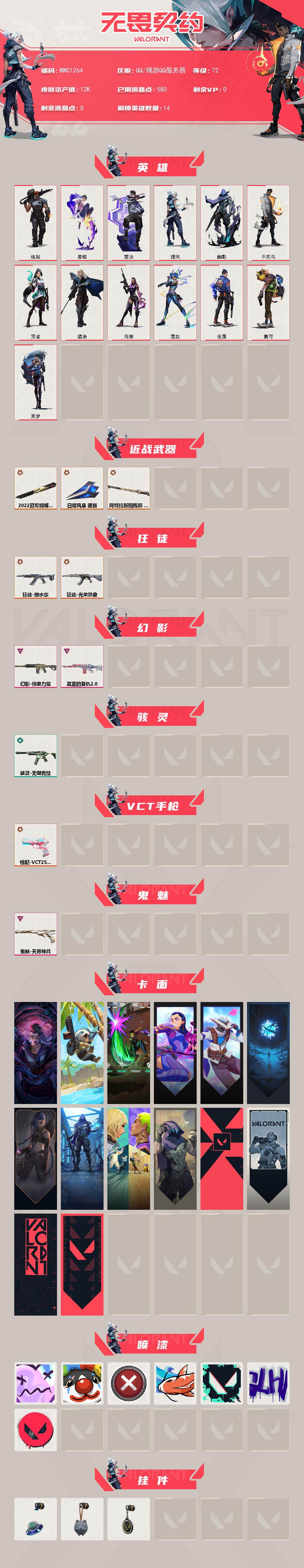 【wwc1264】终极6/卓越3/皮肤35/等级72/段位:未定级/炼狱/暮蝶/壹决/捷风/幽影/不死鸟/贤者/猎枭/芮娜/霓虹/夜露/盖可/黑梦/近战武器-2022全球冠军赛 蝴蝶刀/近战武器-日耀风暴 遗器/近战武器-阿特拉斯指挥部 甩棍/狂徒-塑水宗/狂徒-光荣异象/幻影-盖亚的复仇//2.0/幻影-侦察力量/骇灵-无限竞技/标配-vct25 x blg/鬼魅-天界神兵/分崩离析 卡面/树懒大作战 卡面/源能反应 卡面/无畏契约go!第一卷:芮娜 卡面/无畏契约go!第一卷:零 卡面/无垠星环 卡面/《双城之战》金克丝 卡面/暗呛 卡面/钢锁vs盖可 卡面/黑影先生的咖啡! 卡面/代号红色 卡面/新兵报到 卡面/v契约 卡面/无畏契约 卡面/伤心心 喷漆/小丑猫 喷漆/买装还是存钱 喷漆/红鳞 喷漆/胜利属于无畏契约 喷漆/glhf 喷漆/无畏契约 喷漆/天外飞客 挂饰/《双城之战》魄罗 挂饰/无畏契约 纪念币 挂饰