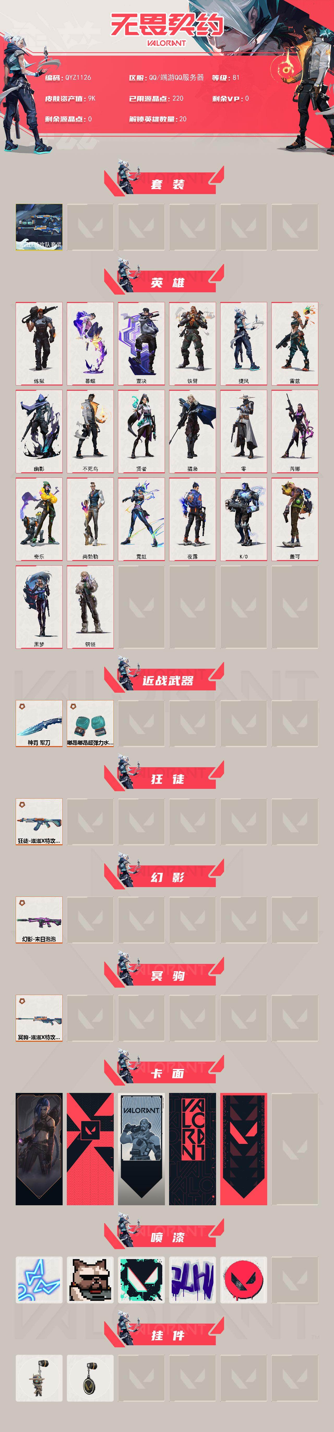 【qyz1126】终极5/皮肤6/等级81/段位:未定级/滋滋x特攻队套装/炼狱/暮蝶/壹决/铁臂/捷风/雷兹/幽影/不死鸟/贤者/猎枭/零/芮娜/奇乐/尚勃勒/霓虹/夜露/k/o/盖可/黑梦/钢锁/近战武器-嘟昂嘟昂超弹力水球拳套/近战武器-神罚 军刀/狂徒-滋滋x特攻队/幻影-末日泡泡/冥驹-滋滋x特攻队/《双城之战》金克丝 卡面/代号红色 卡面/新兵报到 卡面/v契约 卡面/无畏契约 卡面/霓光四射 喷漆/关门放狗 喷漆/胜利属于无畏契约 喷漆/glhf 喷漆/无畏契约 喷漆/无畏契约go!第一卷 零 挂饰/无畏契约 纪念币 挂饰