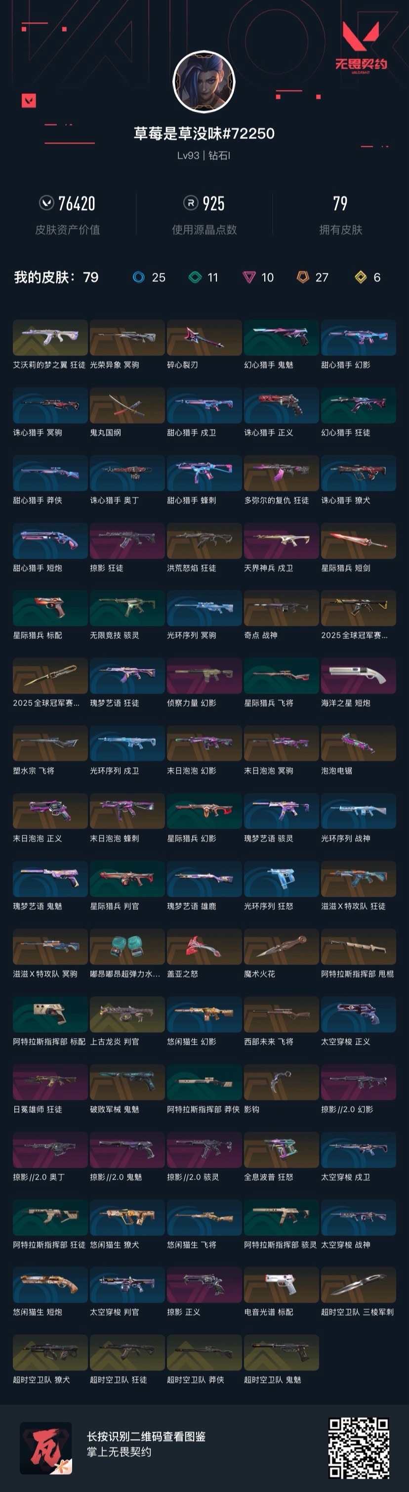 [16545872]27橙皮 6金皮 10紫皮 79皮肤 22英雄 76卡面 925已用源晶 钻石段位 【套装】2025全球冠军赛末日泡泡套装滋滋x特工队掠影2.0套装超时空卫队 【近战武器皮肤】鬼丸国纲超时空卫队 三棱军刺阿特拉斯指挥部影钩魔术火花泡泡电锯星际猎兵 短剑2025全球冠军赛 蝴蝶刀碎心裂刃嘟昂嘟昂超弹力水球拳套盖亚之怒 【佩呛皮肤】标配-电音光谱鬼魅-超时空卫队鬼魅-掠影2.0正义-末日泡泡正义-掠影鬼魅-破败军械狂怒-全息波普短炮-海洋之星 【冲锋呛皮肤】骇灵-掠影2.0蜂刺-末日泡泡 【霰弹呛皮肤】判官-上古龙炎 【步呛皮肤】狂徒-掠影多弥尔的复仇 狂徒2025全球冠军赛 狂徒幻影-末日泡泡狂徒-滋滋x特攻队幻影-掠影2.0獠犬-超时空卫队狂徒-超时空卫队狂徒-洪荒怒焰狂徒-艾沃莉的梦之翼狂徒-日冕雄师幻影-侦察力量戍卫-天界神兵 【狙击呛皮肤】冥驹-光荣异象飞将-西部未来莽侠-超时空卫队冥驹-滋滋x特攻队冥驹-末日泡泡飞将-塑水宗 【机呛皮肤】战神-奇点奥丁-掠影2.0 【挂饰】薰衣草之心挂饰神中神挂饰打不烂的挂饰末日泡泡挂饰v26第一幕纪念币 挂饰2025全球冠军赛挂饰蓄势待滚挂饰双城之战魄罗挂饰数码咒术挂饰