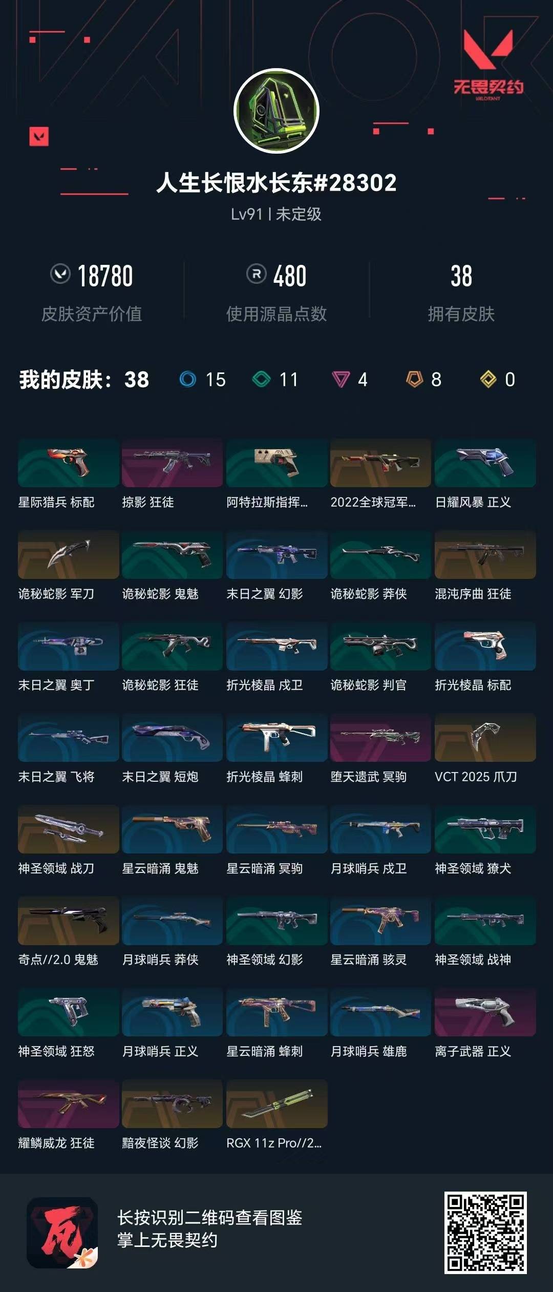 [16420838]8橙皮 4紫皮 38皮肤 12英雄 67卡面 480已用源晶 未定级段位 【套装】vcn2025套装vct 2025赛季礼包 【近战武器皮肤】vct 2025 爪刀rgx 11z pro//2.0 蝴蝶刀神圣领域 战刀诡秘蛇影 【佩呛皮肤】鬼魅-奇点//2.0正义