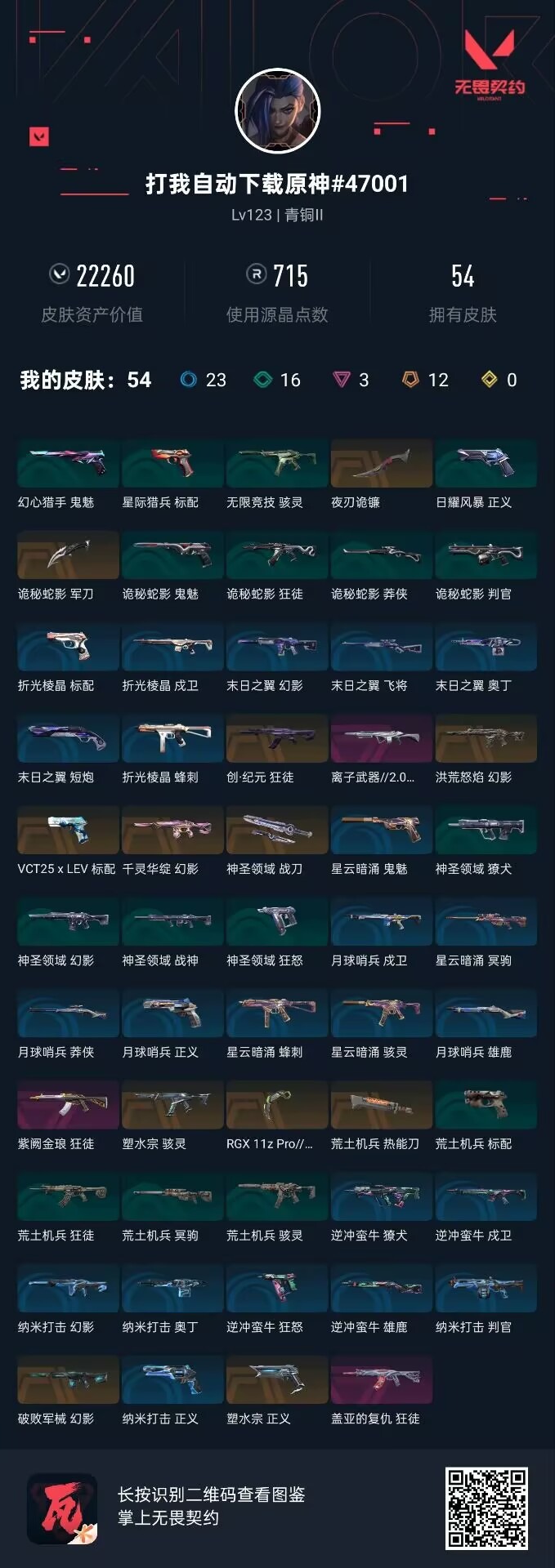 [16420850]12橙皮 3紫皮 54皮肤 17英雄 104卡面 715已用源晶 青铜段位 【近战武器皮肤】夜刃诡镰神圣领域 战刀诡秘蛇影荒土机兵热能刀爪刀-rgx 11z pro 3.0 【佩呛皮肤】标配-vct25xlev正义-塑水宗 【冲锋呛皮肤】骇灵-塑水宗 【步呛皮肤】狂徒