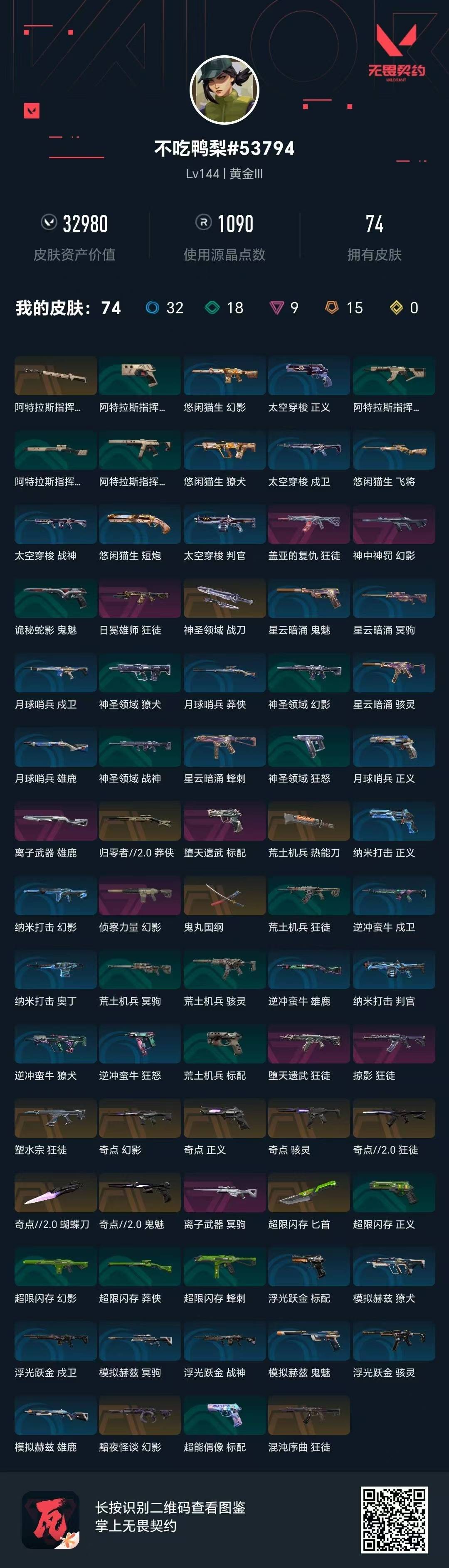 15橙皮 9紫皮 74皮肤 22英雄 120卡面 1090已用源晶 黄金段位 【套装】奇点//2.0套装 【近战武器皮肤】匕首-超限闪存蝴蝶刀-奇点//2.0阿特拉斯指挥部神圣领域 战刀鬼丸国纲荒土机兵热能刀 【佩呛皮肤】鬼魅-奇点//2.0正义-奇点标配-堕天遗武 【冲锋呛皮肤】骇
