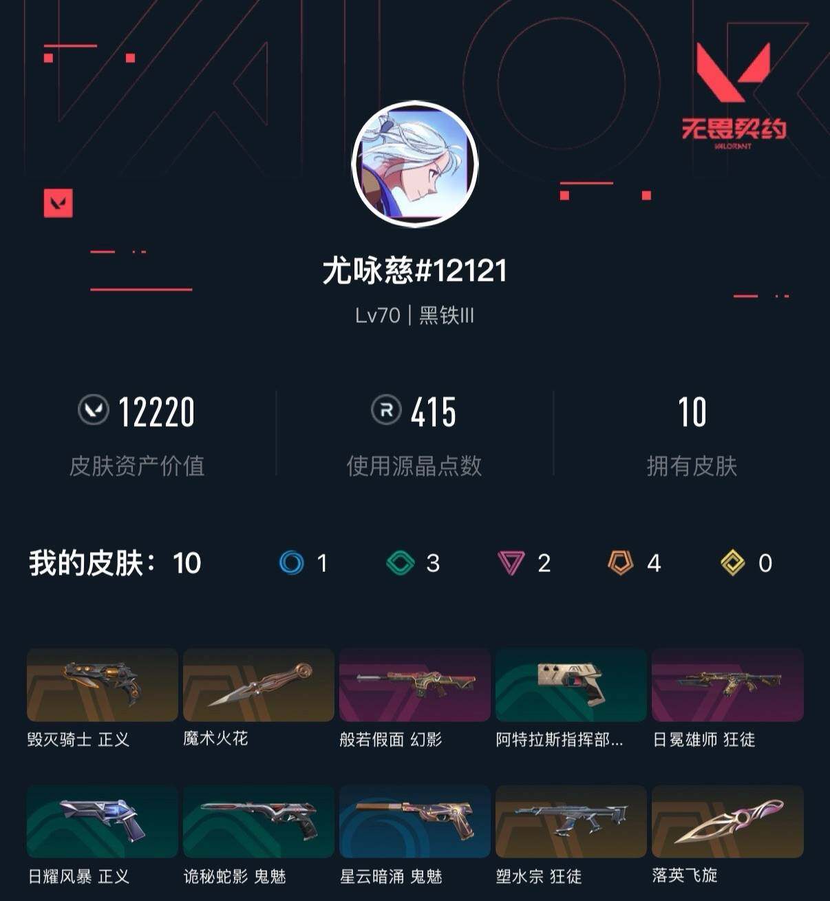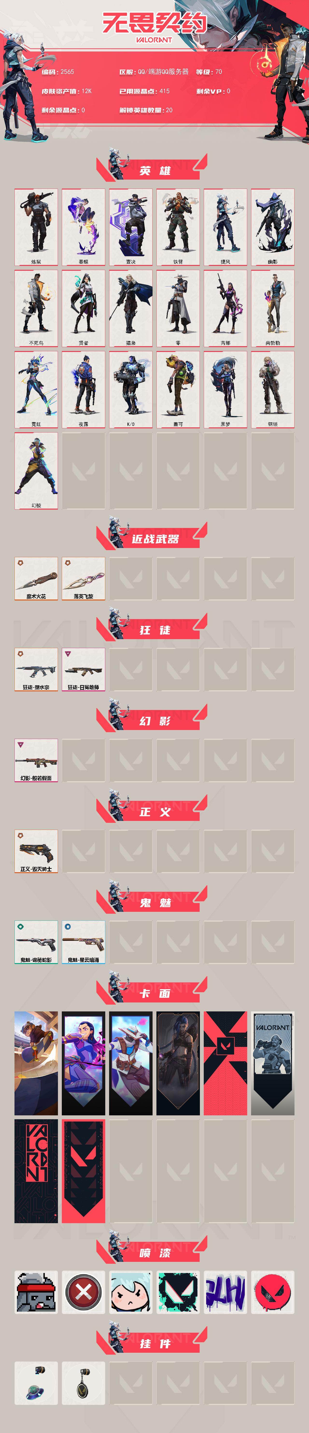 [16547381]【英雄】:幻棱,炼狱,暮蝶,壹决,铁臂,捷风,幽影,不死鸟,贤者,猎枭,零,芮娜,尚勃勒,霓虹,夜露,k/o,盖可,黑梦,钢锁 【近战武器】:近战武器-魔术火花,近战武器-落英飞旋,近战武器-魔术火花 【狂徒】:狂徒-塑水宗,狂徒-日冕雄师 【幻影】:幻影-般若假面 【正义】:正义-毁灭骑士 【鬼魅】:鬼魅-诡秘蛇影,鬼魅-星云暗涌 【卡面】:clutch 卡面,无畏契约go!第一卷:芮娜 卡面,无畏契约go!第一卷:零 卡面,《双城之战》金克丝 卡面,代号红色 卡面,新兵报到 卡面,v契约 卡面,无畏契约 卡面 【喷漆】:战“素”兔 喷漆,买装还是存钱 喷漆,飓刃涂鸦 喷漆 ,胜利属于无畏契约 喷漆,glhf 喷漆,无畏契约 喷漆 【挂饰】:天外飞客 挂饰,无畏契约 纪念币 挂饰