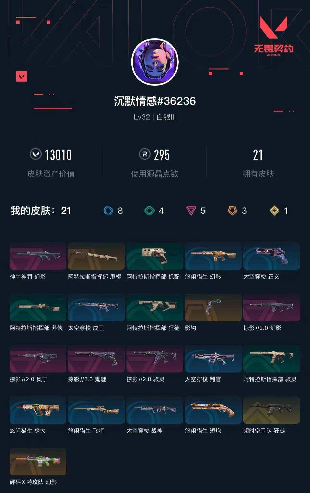 [16547390]【套装】:掠影//2.0套装 【英雄】:炼狱,暮蝶,壹决,捷风,幽影,不死鸟,贤者,猎枭,芮娜,盖可,黑梦 【近战武器】:近战武器-影钩,近战武器-阿特拉斯指挥部 甩棍 【狂徒】:狂徒-超时空卫队 【幻影】:幻影-砰砰x特攻队,幻影-神中神罚,幻影-掠影//2.0 【奥丁】:奥丁-掠影//2.0 【骇灵】:骇灵-掠影//2.0 【鬼魅】:鬼魅-掠影//2.0 【卡面】:无畏契约go!第一卷:芮娜 卡面,无畏契约go!第一卷:零 卡面,《双城之战》金克丝 卡面,钢锁vs盖可 卡面,代号红色 卡面,新兵报到 卡面,v契约 卡面,无畏契约 卡面 【喷漆】:审判之爪 喷漆,买装还是存钱 喷漆,无畏契约go!第一卷:奇乐 喷漆,放下武器 喷漆,胜利属于无畏契约 喷漆,glhf 喷漆,无畏契约 喷漆 【挂饰】:薰衣草之心 挂饰,好运福爪 挂饰,红鳞松叶 挂饰,无畏契约 纪念币 挂饰