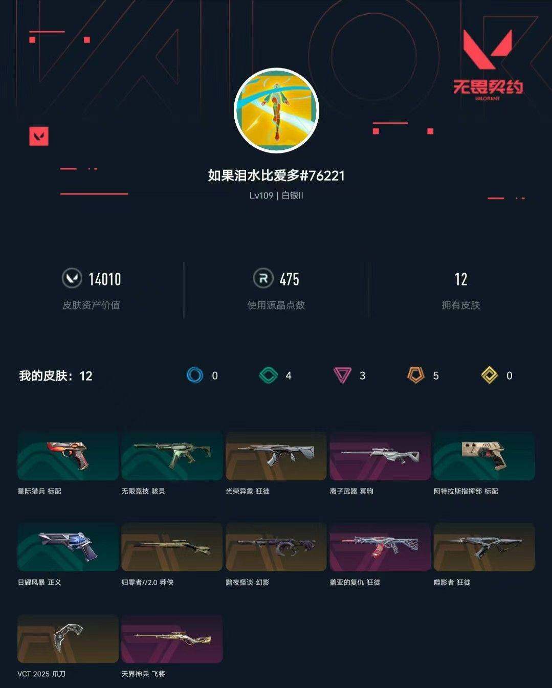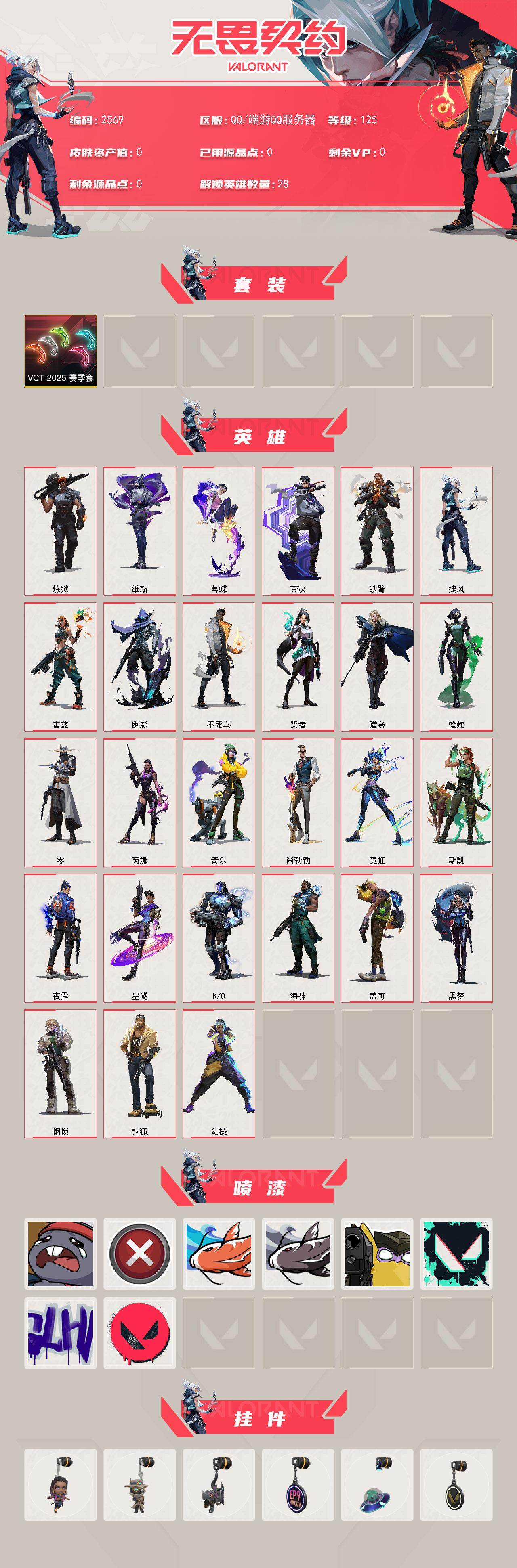 [16547419]【套装】:vct 2025 赛季套装 【英雄】:幻棱,炼狱,维斯,暮蝶,钛狐,壹决,铁臂,捷风,雷兹,幽影,不死鸟,贤者,猎枭,蝰蛇,零,芮娜,奇乐,尚勃勒,霓虹,斯凯,夜露,星礈,k/o,海神,盖可,黑梦,钢锁 【近战武器】:近战武器-vct 2025 爪刀 【狂徒】:狂徒-噬影者,狂徒-光荣异象,狂徒-盖亚的复仇 【幻影】:幻影-黯夜怪谈 【冥驹】:冥驹-离子武器 【飞将】:飞将-天界神兵 【莽侠】:莽侠-归零者//2.0 【骇灵】:骇灵-无限竞技 【卡面】:南瓜盛典 卡面,修车达人 卡面,正义的化身 卡面,霓帧牛蛙 卡面,无畏契约go!第一卷:芮娜 卡面,无畏契约go!第一卷:零 卡面,代号红色 卡面,新兵报到 卡面,v契约 卡面,无畏契约 卡面 【喷漆】:熊抱 喷漆,买装还是存钱 喷漆,红鳞 喷漆,松叶 喷漆,放下武器 喷漆,胜利属于无畏契约 喷漆,glhf 喷漆,无畏契约 喷漆 【挂饰】:无畏契约go!第一卷 芮娜 挂饰,无畏契约go!第一卷 零 挂饰,鱼骨头 挂饰,第九季//第二幕 纪念币 挂饰,天外飞客 挂饰,无畏契约 纪念币 挂饰