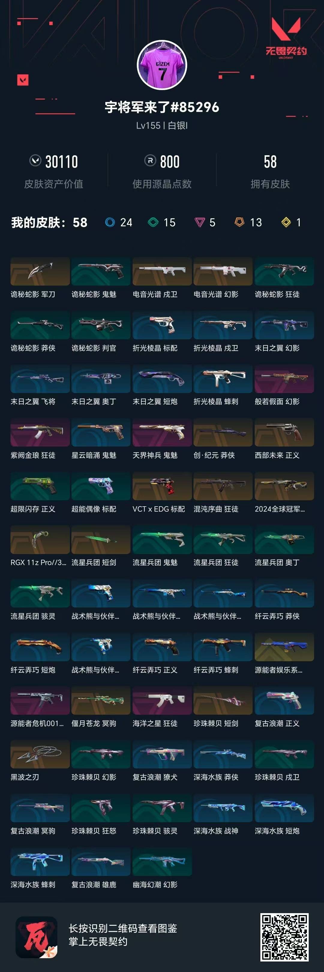 [16422925]13橙皮 1金皮 5紫皮 58皮肤 28英雄 96卡面 800已用源晶 白银段位 【亮点皮肤】幻影-2024全球冠军赛 【近战武器皮肤】诡秘蛇影短剑-流星兵团黑波之刃爪刀-rgx 11z pro 3.0短剑-珍珠棘贝 【佩呛皮肤】正义-西部未来鬼魅-天界神兵标配-v