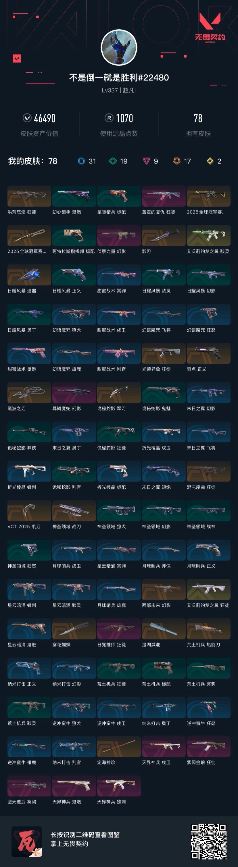 17橙皮 2金皮 9紫皮 78皮肤 13英雄 148卡面 1070已用源晶 超凡段位 【套装】vcn2025套装vct 2025赛季礼包2025全球冠军赛 【近战武器皮肤】日耀风暴 遗器神圣领域 战刀诡秘蛇影vct 2025 爪刀影刃穿花蝴蝶荒土机兵热能刀2025全球冠军赛