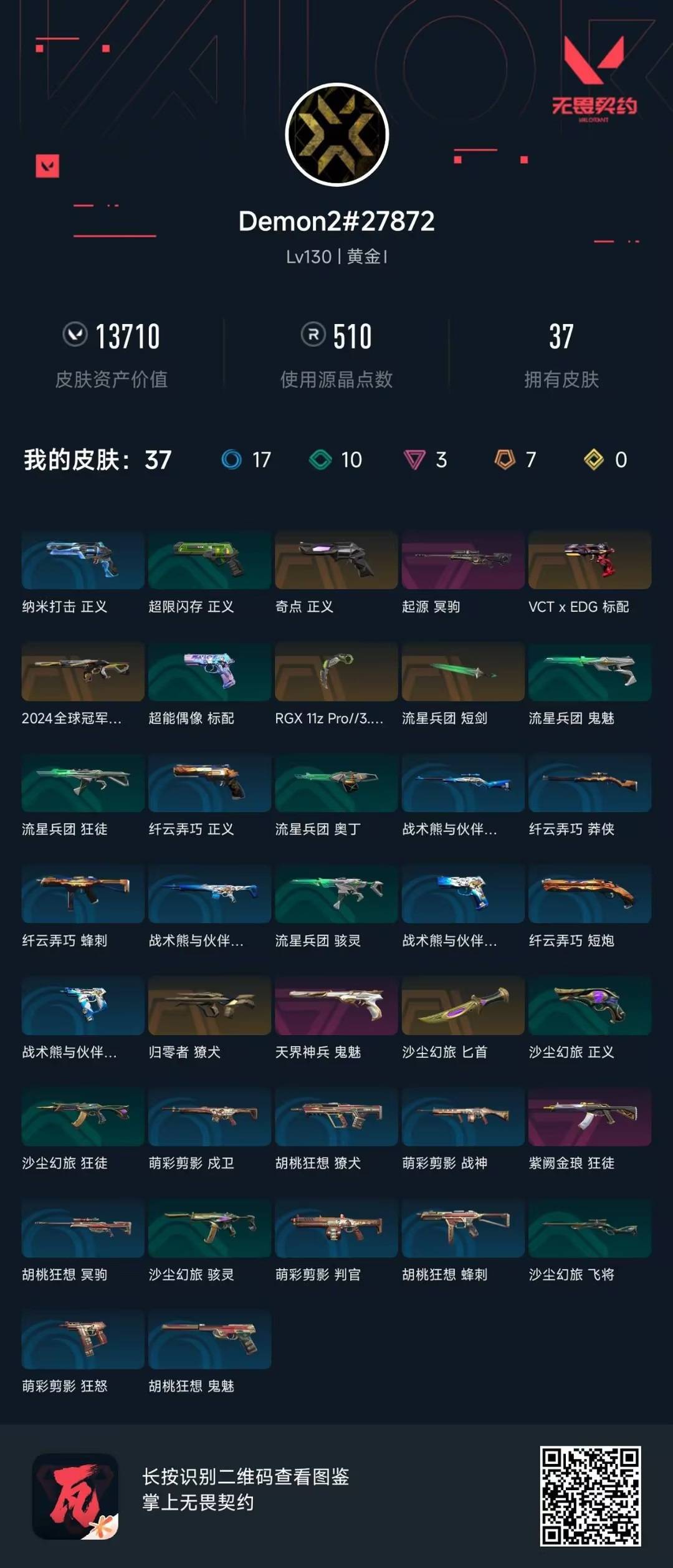 [16548346]7橙皮 3紫皮 37皮肤 27英雄 99卡面 510已用源晶 黄金段位 【亮点皮肤】幻影-2024全球冠军赛 【近战武器皮肤】短剑-流星兵团爪刀-rgx 11z pro 3.0匕首-沙尘幻旅 【佩呛皮肤】正义-奇点鬼魅-天界神兵标配-vctxedg 【步呛皮肤】狂徒-紫阙金琅獠犬-归零者 【狙击呛皮肤】冥驹-起源 【挂饰】袖珍捷风挂饰薰衣草之心挂饰改变者全球冠军赛奖杯挂饰神中神挂饰2021冠军巡回赛花火挂饰针织蜜蜂挂饰冬日絮语挂饰糖葫芦挂饰蓄势待滚挂饰云开见日挂饰幸运中国结挂饰鱼骨头挂饰双城之战小蛋糕挂饰星荷璀璨挂饰终章ko小金人挂饰vctxedg挂饰高音谱号挂饰迷你机甲挂饰