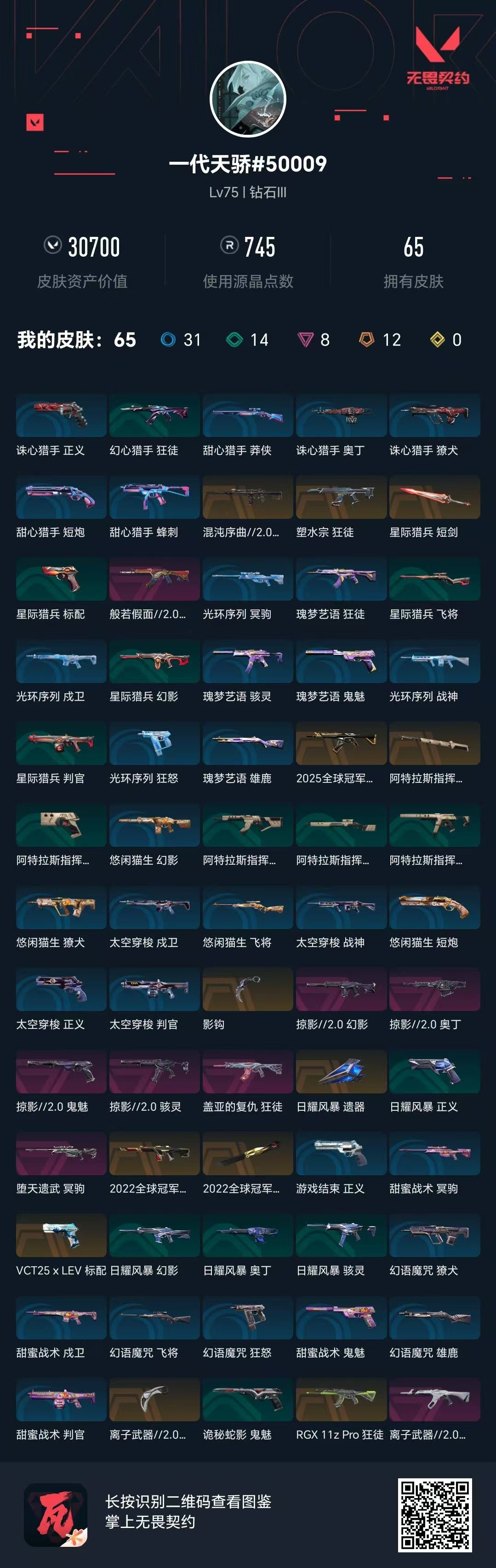 [16548353]12橙皮 8紫皮 65皮肤 17英雄 76卡面 745已用源晶 钻石段位 【亮点皮肤】幻影-2022全球冠军赛蝴蝶刀-2022全球冠军赛 【套装】掠影2.0套装2022全球冠军赛 【近战武器皮肤】阿特拉斯指挥部影钩离子武器2.0 爪刀星际猎兵 短剑 【佩呛皮肤】鬼魅-掠影2.0标配-vct25xlev 【冲锋呛皮肤】骇灵-掠影2.0 【步呛皮肤】狂徒-离子武器2.0狂徒-般若假面//2.0幻影-混沌序曲2.02025全球冠军赛 狂徒幻影-掠影2.0狂徒-rgx 11z pro狂徒-盖亚的复仇狂徒-塑水宗 【狙击呛皮肤】冥驹-堕天遗武 【机呛皮肤】奥丁-掠影2.0 【挂饰】袖珍捷风挂饰2022全球冠军赛弯檐帽挂饰vctxlev挂饰双城之战魄罗挂饰飞刀挂饰