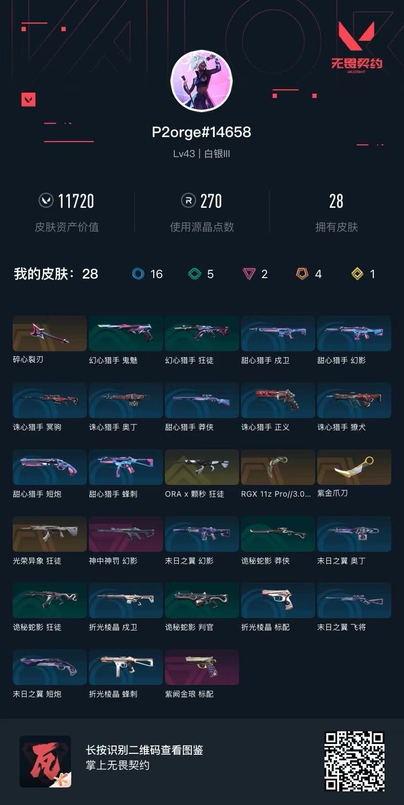[16548679]4橙皮 1金皮 2紫皮 28皮肤 16英雄 33卡面 270已用源晶 白银段位 【近战武器皮肤】紫金爪刀碎心裂刃爪刀-rgx 11z pro 3.0 【佩呛皮肤】标配-紫阙金琅 【步呛皮肤】幻影-神中神罚狂徒-光荣异象狂徒-ax颗秒 【挂饰】神中神挂饰