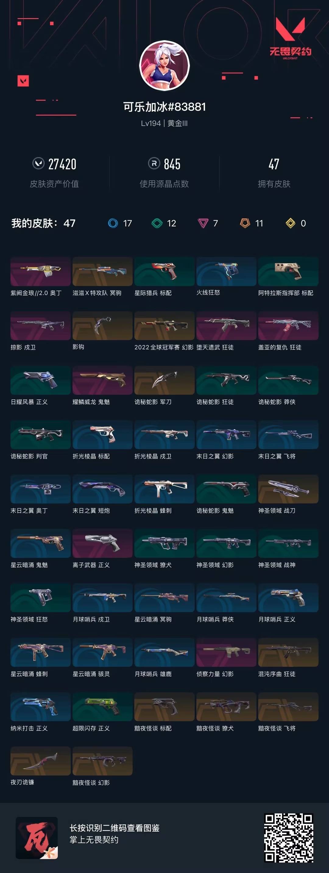 11橙皮 7紫皮 47皮肤 23英雄 94卡面 845已用源晶 黄金段位 【套装】黯夜怪谈套装 【近战武器皮肤】神圣领域 战刀诡秘蛇影夜刃诡镰影钩 【佩呛皮肤】标配-黯夜怪谈正义-离子武器鬼魅-耀鳞威龙 【步呛皮肤】幻影-黯夜怪谈獠犬-黯夜怪谈狂徒-混沌序曲戍卫-掠影狂徒-盖亚的