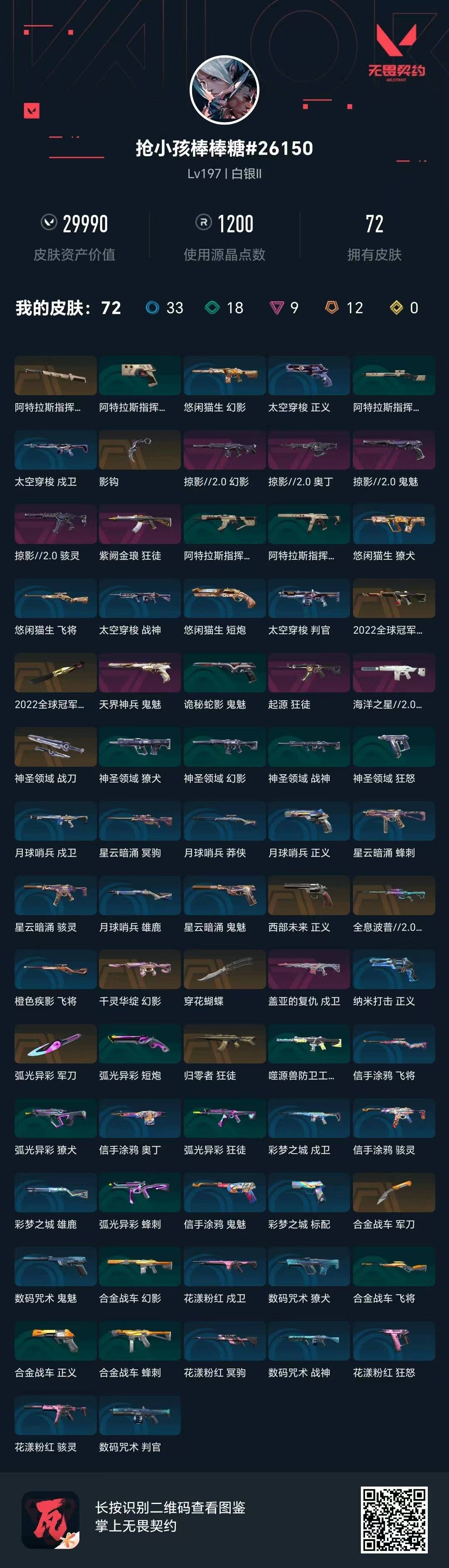 [16549068]12橙皮 9紫皮 72皮肤 28英雄 121卡面 1200已用源晶 白银段位 【亮点皮肤】蝴蝶刀-2022全球冠军赛幻影-2022全球冠军赛 【套装】2022全球冠军赛掠影2.0套装 【近战武器皮肤】军刀-合金战车穿花蝴蝶军刀-弧光异彩影钩神圣领域 战刀阿特拉斯指挥部 【佩呛皮肤】鬼魅-天界神兵正义-西部未来鬼魅-掠影2.0 【冲锋呛皮肤】骇灵-掠影2.0 【步呛皮肤】幻影-海洋之星2.0狂徒-归零者幻影-掠影2.0狂徒-起源幻影-千灵华绽狂徒-紫阙金琅戍卫-盖亚的复仇 【狙击呛皮肤】冥驹-全息波普//2.0 【机呛皮肤】奥丁-掠影2.0 【挂饰】袖珍捷风挂饰鱼骨头挂饰数码咒术挂饰幸运中国结挂饰神中神挂饰冬日絮语挂饰双城之战小蛋糕挂饰2022全球冠军赛弯檐帽挂饰