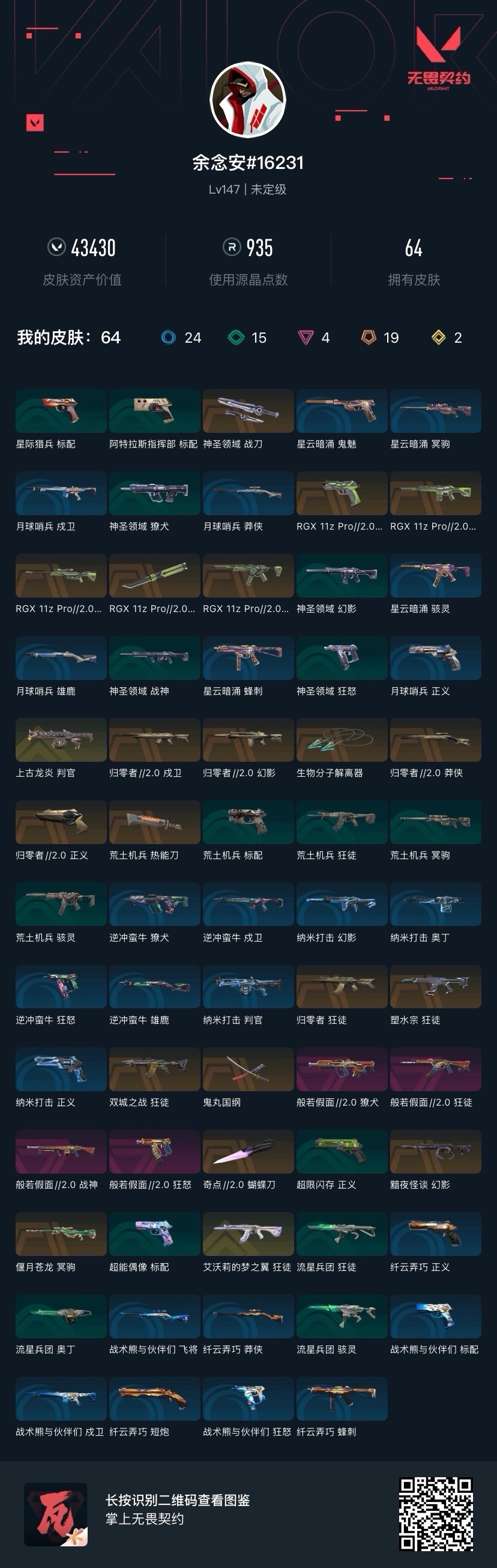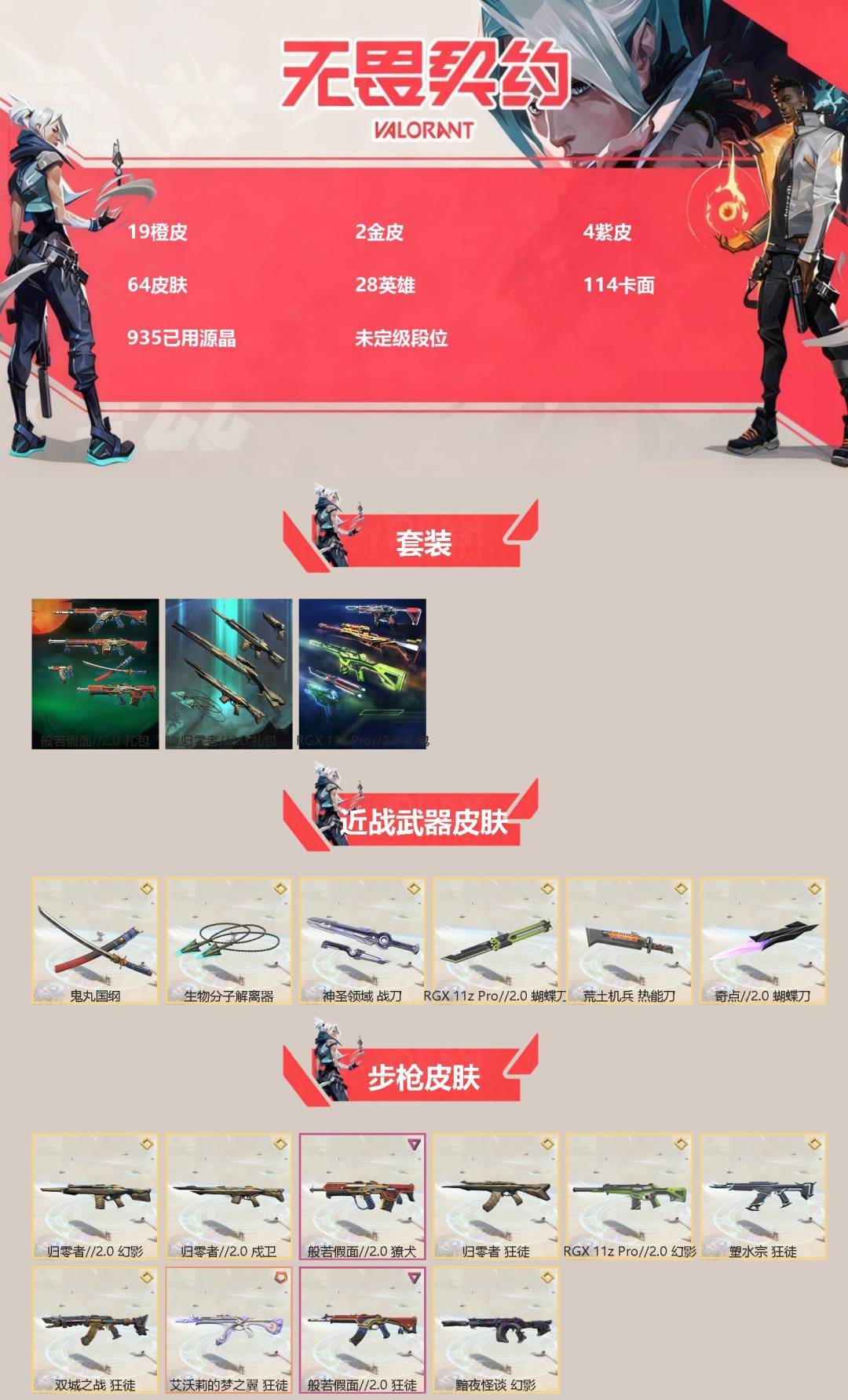 [16425292]19橙皮 2金皮 4紫皮 64皮肤 28英雄 114卡面 935已用源晶 未定级段位 【套装】rgx 11z pro//2.0归零者//2.0套装般若假面//2.0套装 【近战武器皮肤】蝴蝶刀-奇点//2.0神圣领域 战刀rgx 11z pro//2.0 蝴蝶刀生物分