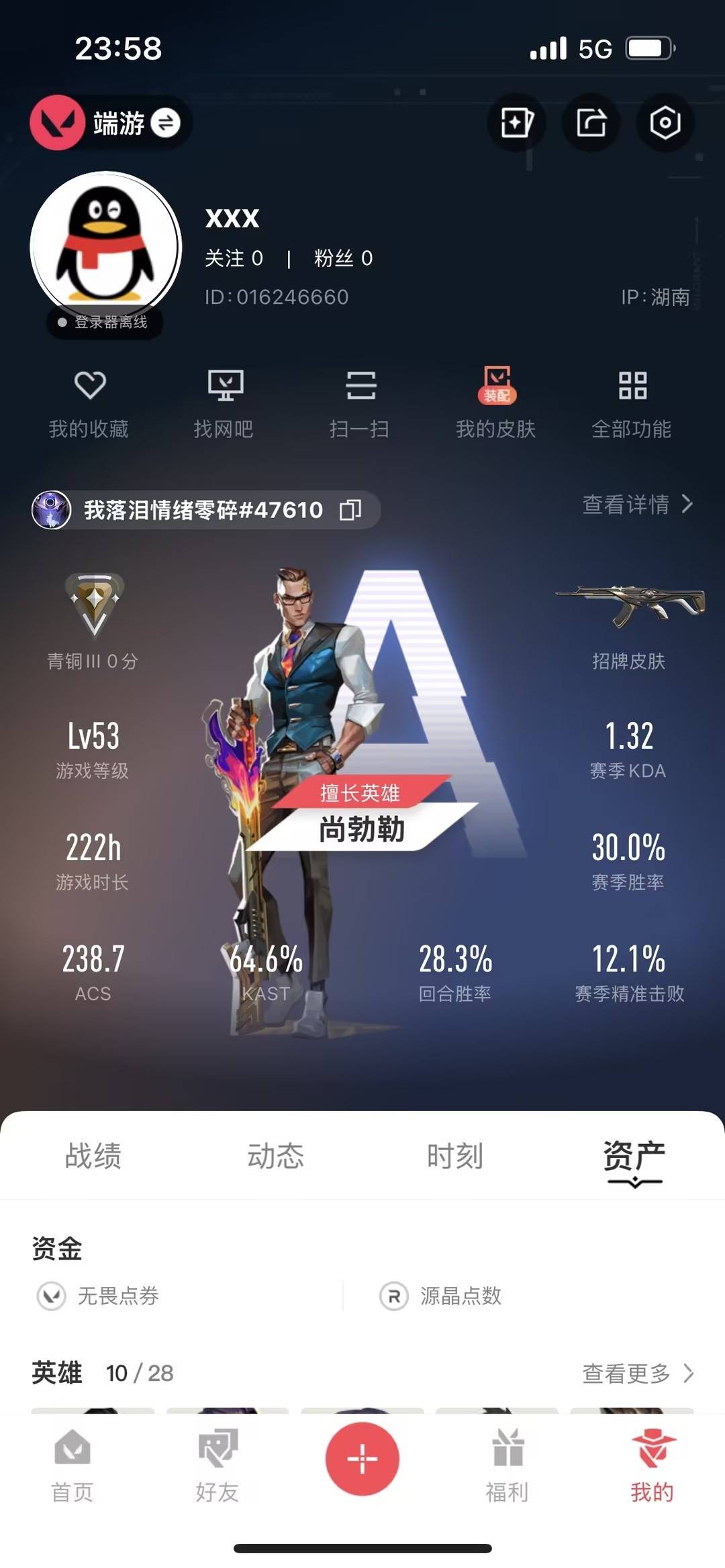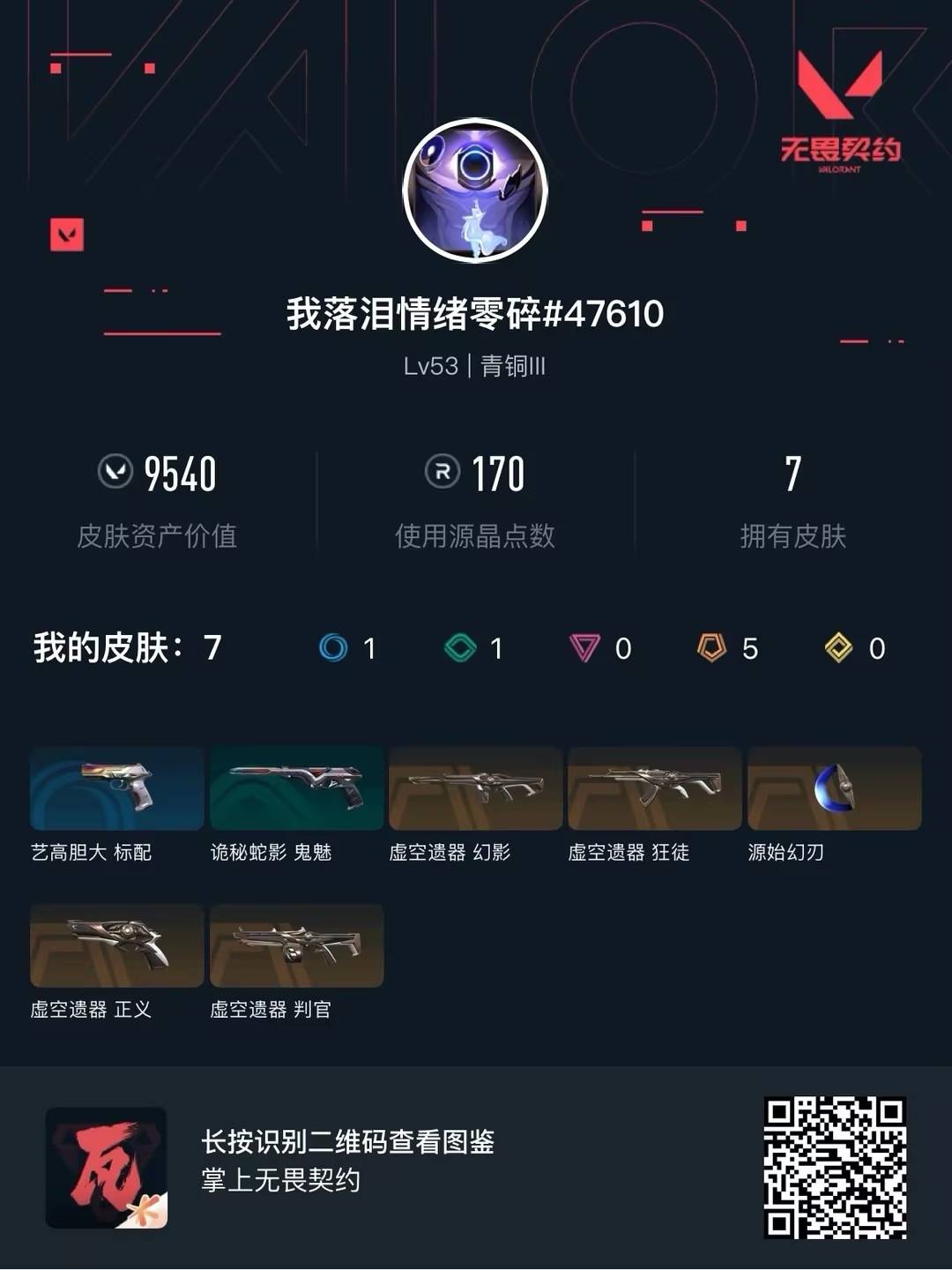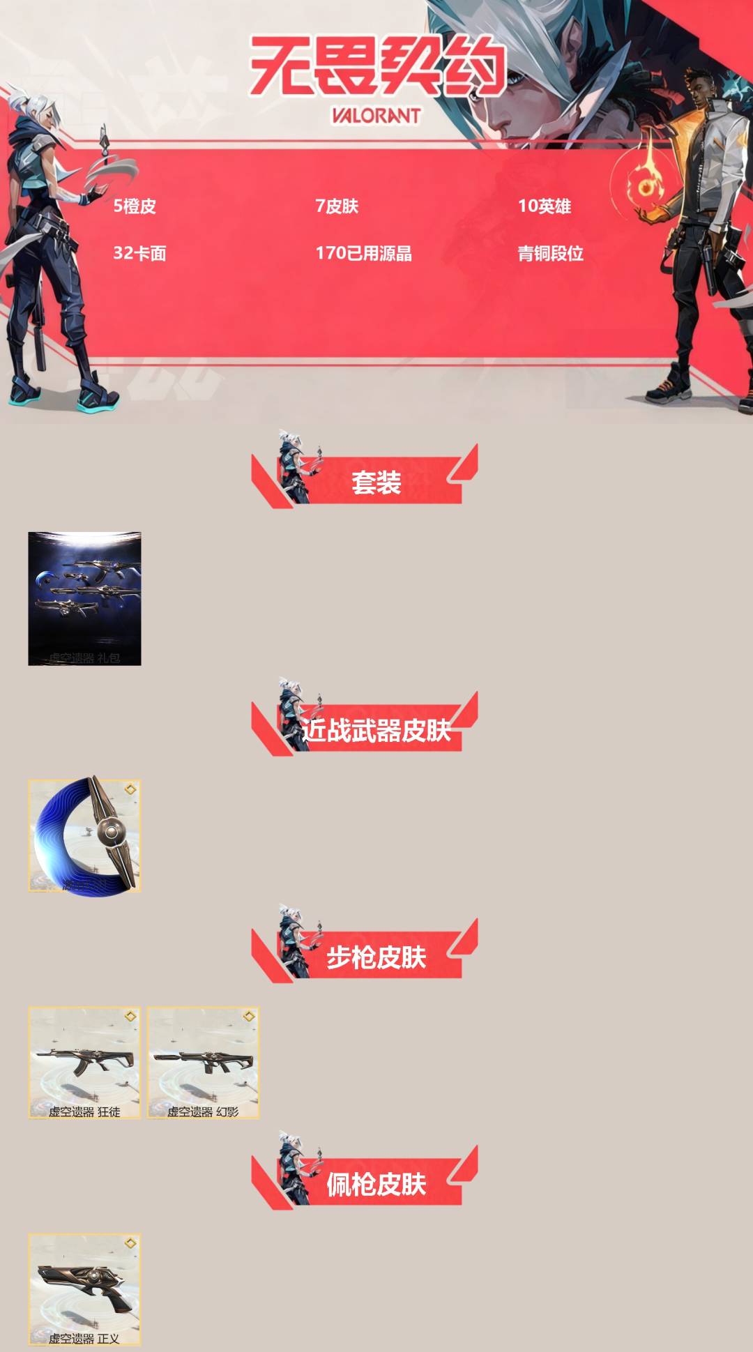 [16425458]5橙皮 7皮肤 10英雄 32卡面 170已用源晶 青铜段位 【套装】虚空遗器 【近战武器皮肤】源始幻刃 【佩呛皮肤】正义-虚空遗器 【霰弹呛皮肤】判官-虚空遗器 【步呛皮肤】狂徒-虚空遗器幻影-虚空遗器 【挂饰】神中神挂饰