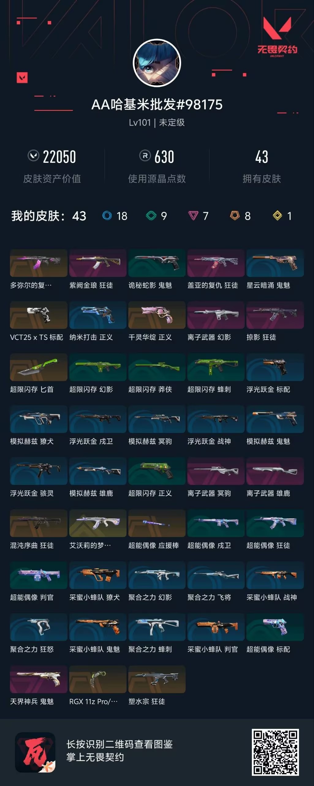 8橙皮 1金皮 7紫皮 43皮肤 25英雄 76卡面 630已用源晶 未定级段位 【近战武器皮肤】匕首-超限闪存爪刀-rgx 11z pro 3.0超能偶像 应援棒 【佩呛皮肤】标配-vct25xts正义-千灵华绽鬼魅-天界神兵 【霰弹呛皮肤】雄鹿-离子武器 【步呛皮肤】狂徒-掠影多弥尔