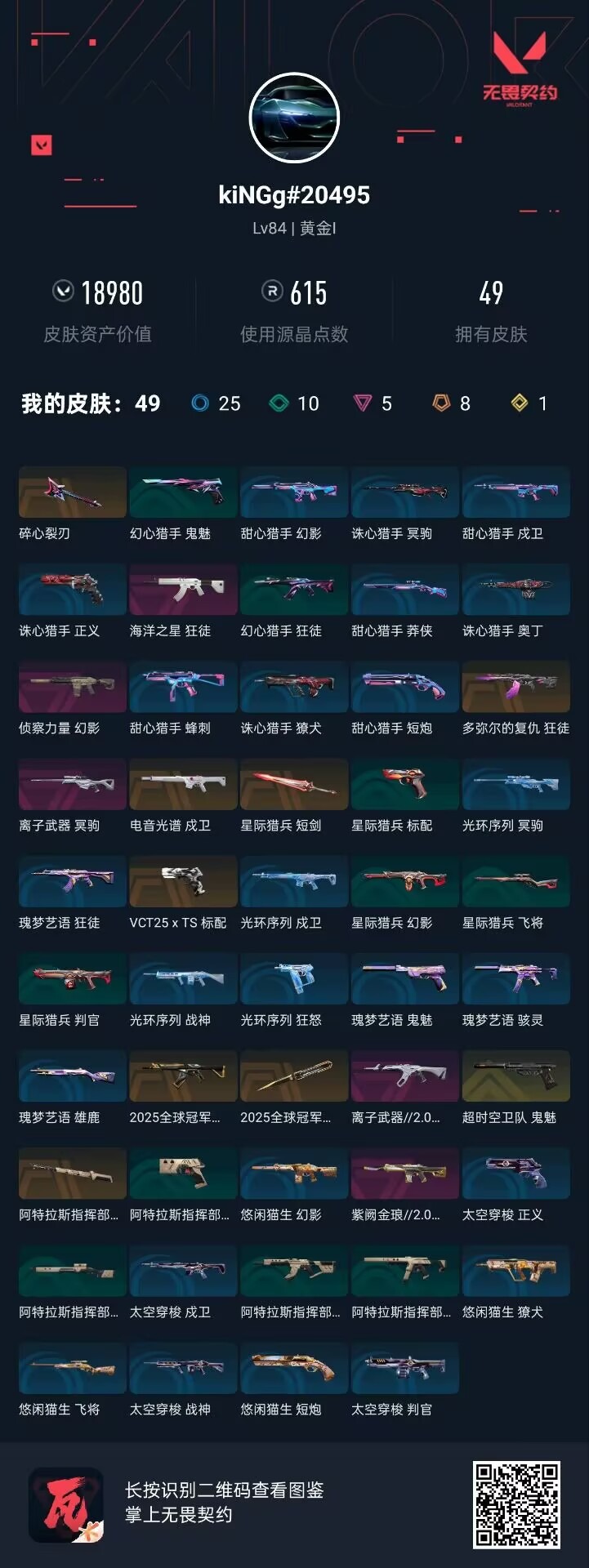 [16426036]8橙皮 1金皮 5紫皮 49皮肤 18英雄 64卡面 615已用源晶 黄金段位 【套装】:2025全球冠军赛曲奇套装 【近战武器皮肤】:星际猎兵 短剑2025全球冠军赛 蝴蝶刀阿特拉斯指挥部碎心裂刃 【佩呛皮肤】:标配-vct25xts鬼魅-超时空卫队 【步呛皮肤】: