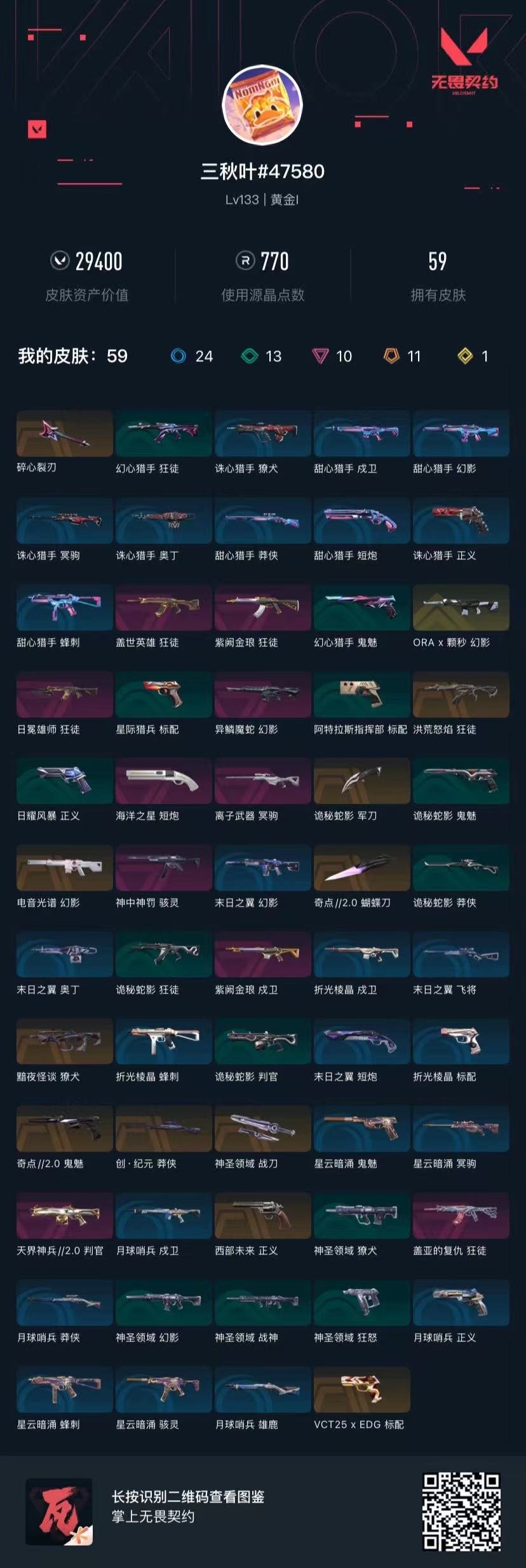 [16551093]11橙皮 1金皮 10紫皮 59皮肤 28英雄 90卡面 770已用源晶 黄金段位 【套装】曲奇套装 【近战武器皮肤】神圣领域 战刀诡秘蛇影蝴蝶刀-奇点//2.0碎心裂刃 【佩呛皮肤】标配-vct25xedg鬼魅-奇点//2.0正义-西部未来短炮-海洋之星 【冲锋呛皮肤】骇灵-神中神罚 【霰弹呛皮肤】判官-天界神兵2.0 【步呛皮肤】獠犬-黯夜怪谈幻影-电音光谱幻影-异鳞魔蛇幻影-ax颗秒狂徒-紫阙金琅狂徒-洪荒怒焰狂徒-盖亚的复仇狂徒-盖世英雄狂徒-日冕雄师戍卫-紫阙金琅 【狙击呛皮肤】莽侠-创·纪元冥驹-离子武器 【挂饰】薰衣草之心挂饰神中神挂饰蓄势待滚挂饰vctxedg挂饰