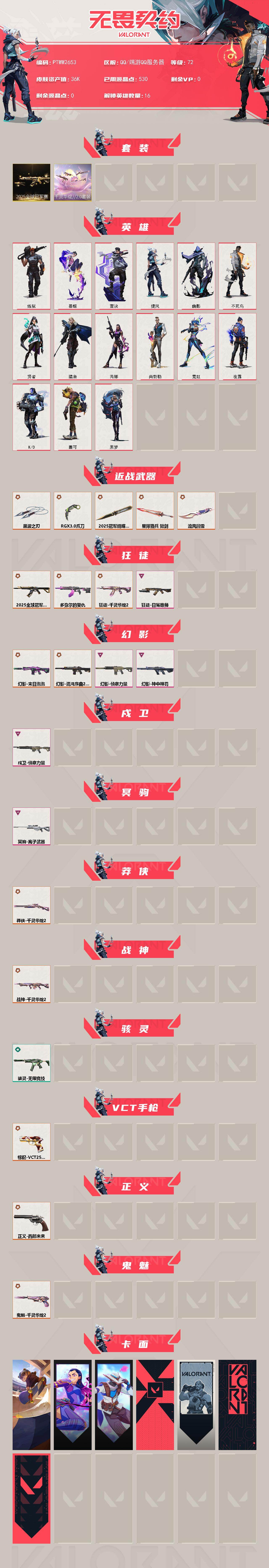 【套装】:2025全球冠军赛套装,千灵华绽//2.0套装 【英雄】:炼狱,暮蝶,壹决,捷风,幽影,不死鸟,贤者,猎枭,芮娜,尚勃勒,霓虹,夜露,k/o,盖可,黑梦 【近战武器】:近战武器-2025全球冠军赛 蝴蝶刀,近战武器-流风回雪,近战武器-rgx 11z pro//3.0 爪刀,近战武器-黑波之刃,近战武器-星际猎兵 短剑 【狂徒】:狂徒-2025全球冠军赛,狂徒-多弥尔的复仇,狂徒-千