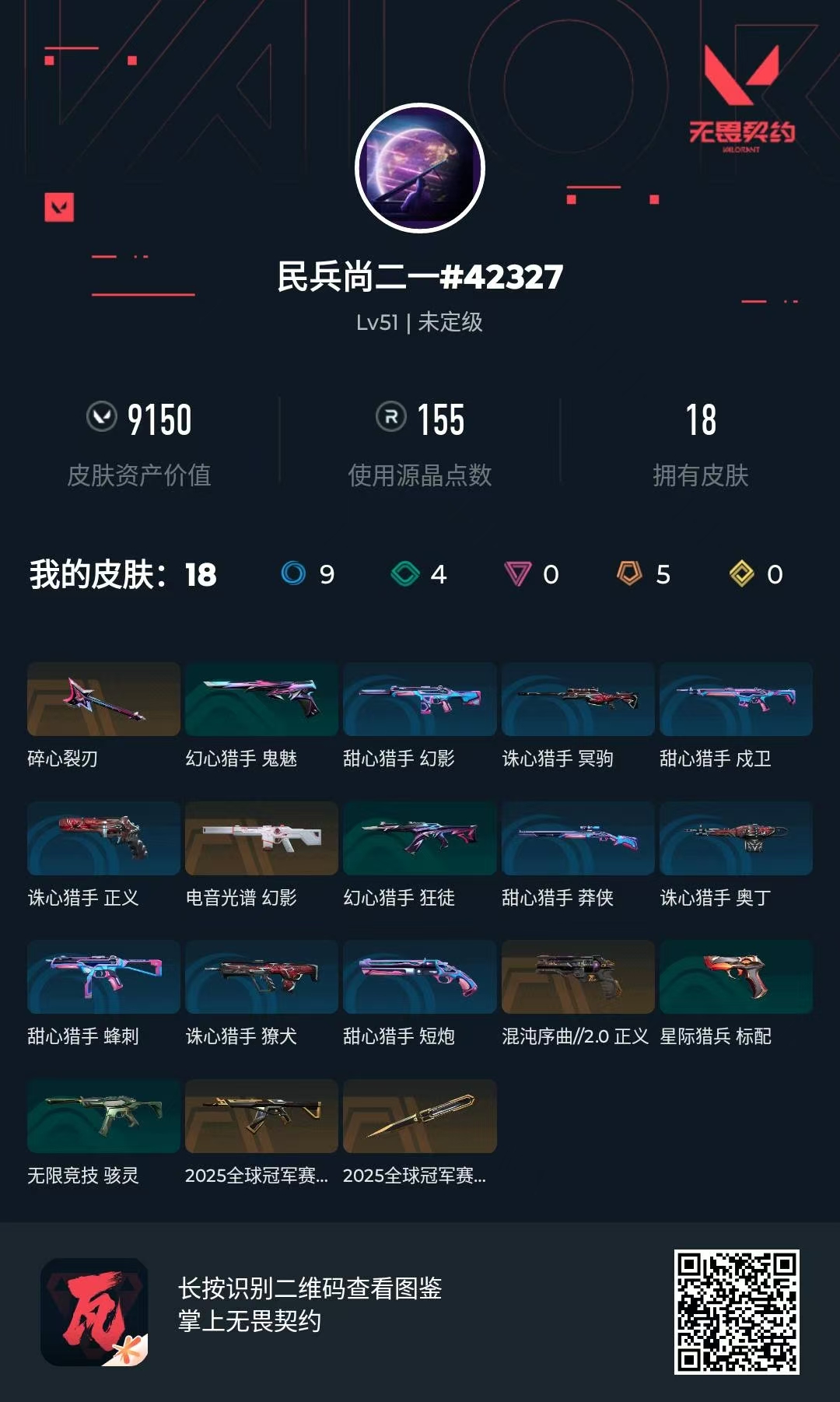 [16553024]s193535(2025全球冠军赛套装)无畏契约/51等级/未定级段位/20英雄/18皮肤/资产9150/已使用r点155/剩余r点170/ 2025全球冠军赛-狂徒2025全球冠军赛-蝴蝶刀,电音光谱-幻影,碎心裂刃,混沌序曲//2.0-正义