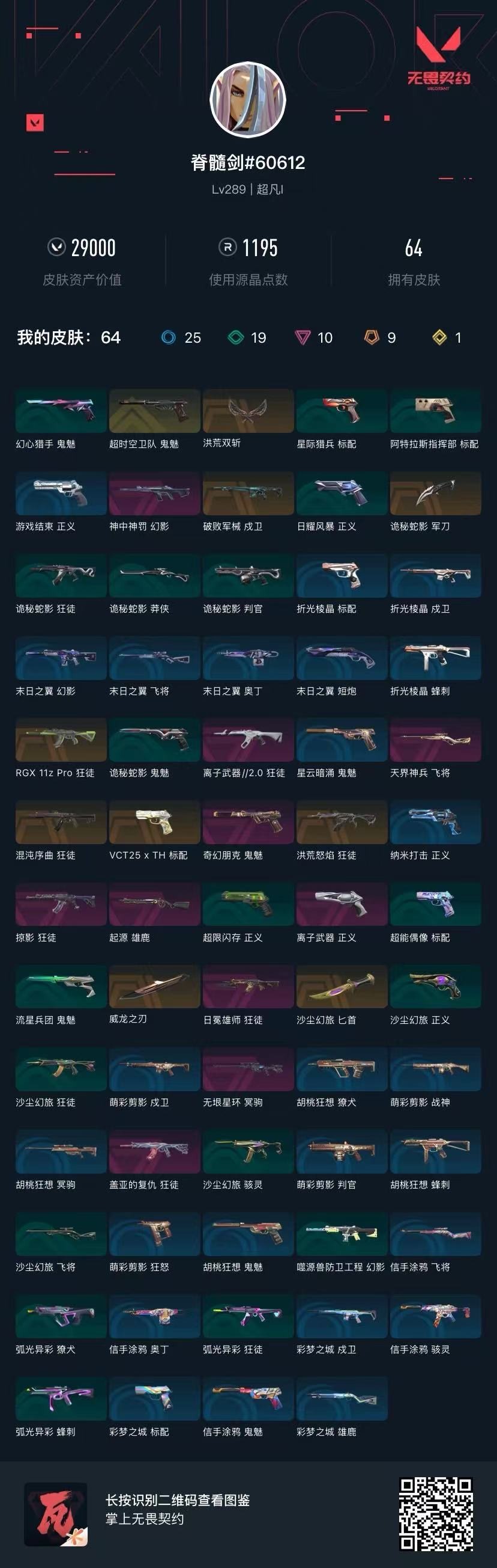 [16428256]9橙皮 1金皮 10紫皮 64皮肤 28英雄 148卡面 1195已用源晶 超凡段位 【套装】:曲奇套装 【近战武器皮肤】:诡秘蛇影威龙之刃洪荒双斩匕首-沙尘幻旅 【佩呛皮肤】:标配-vct25xth鬼魅-超时空卫队正义-离子武器鬼魅-奇幻朋克 【霰弹呛皮肤】:雄鹿