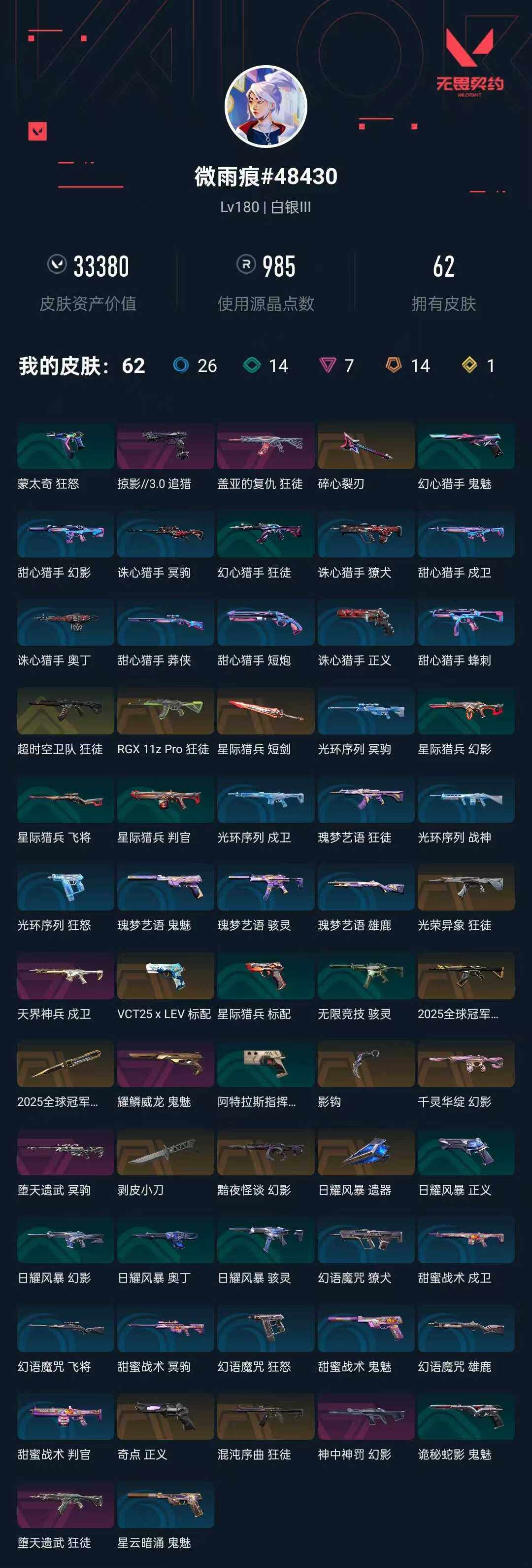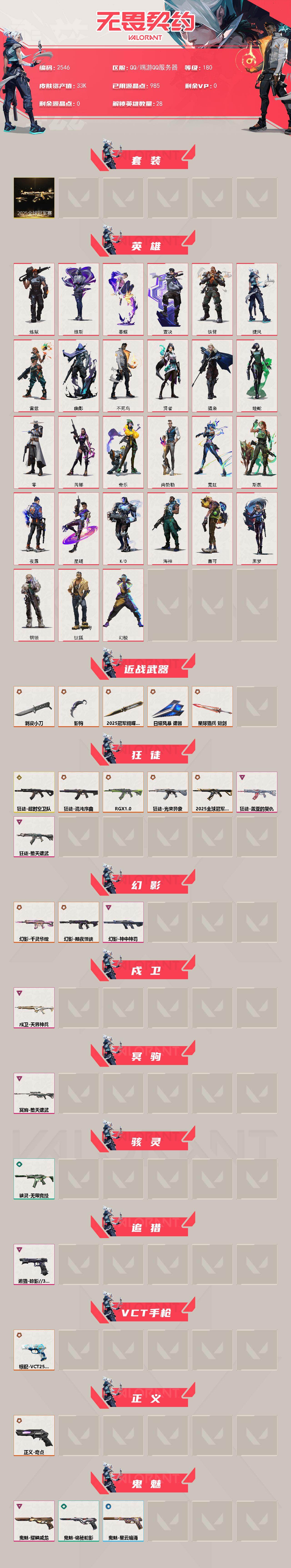 [16558273]【套装】:2025全球冠军赛套装 【英雄】:幻棱,炼狱,维斯,暮蝶,钛狐,壹决,铁臂,捷风,雷兹,幽影,不死鸟,贤者,猎枭,蝰蛇,零,芮娜,奇乐,尚勃勒,霓虹,斯凯,夜露,星礈,k/o,海神,盖可,黑梦,钢锁 【近战武器】:近战武器-2025全球冠军赛 蝴蝶刀,近战武器-影钩,近战武器-剥皮小刀,近战武器-日耀风暴 遗器,近战武器-星际猎兵 短剑 【狂徒】:狂徒-超时空卫队,狂徒-2025全球冠军赛,狂徒-混沌序曲,狂徒-rgx 11z pro,狂徒-光荣异象,狂徒-堕天遗武,狂徒-盖亚的复仇 【幻影】:幻影-黯夜怪谈,幻影-千灵华绽,幻影-神中神罚 【戍卫】:戍卫-天界神兵 【冥驹】:冥驹-堕天遗武 【骇灵】:骇灵-无限竞技 【追猎】:追猎-掠影//3.0 【vct手呛】:标配-vct25 x lev 【正义】:正义-奇点 【鬼魅】:鬼魅-耀鳞威龙,鬼魅-诡秘蛇影,鬼魅-星云暗涌 【卡面】:无畏契约:暮蝶 卡面,热舞环节 卡面,归乡 // 蝰蛇 卡面,超能偶像 卡面,树懒大作战 卡面,clutch 卡面,霓帧牛蛙 卡面,聚合之力 卡面,哨卫者之领域 卡面,虹吸式咖啡壶 卡面,无畏契约go!第一卷:芮娜 卡面,无畏契约go!第一卷:零 卡面,无垠星环 卡面,《双城之战》金克丝 卡面,无畏契约go!第一卷:贤者 卡面,钢锁vs盖可 卡面,别冒尖 卡面,代号红色 卡面,新兵报到 卡面,v契约 卡面,无畏契约 卡面 【喷漆】:伤心心 喷漆,霓光四射 喷漆,买装还是存钱 喷漆,酷熊冲浪 喷漆,无畏契约go!第一卷:芮娜 喷漆,红鳞 喷漆,暴走萝莉 喷漆,松叶 喷漆,无畏契约go!第一卷:奇乐 喷漆,静电火花 喷漆 ,放下武器 喷漆,胜利属于无畏契约 喷漆,glhf 喷漆,无畏契约 喷漆 【挂饰】:z世代特饮 挂饰,动力机箱 挂饰,天外飞客 挂饰,《双城之战》魄罗 挂饰,盆栽小友 挂饰,海豹的认可 挂饰,无畏契约 纪念币 挂饰