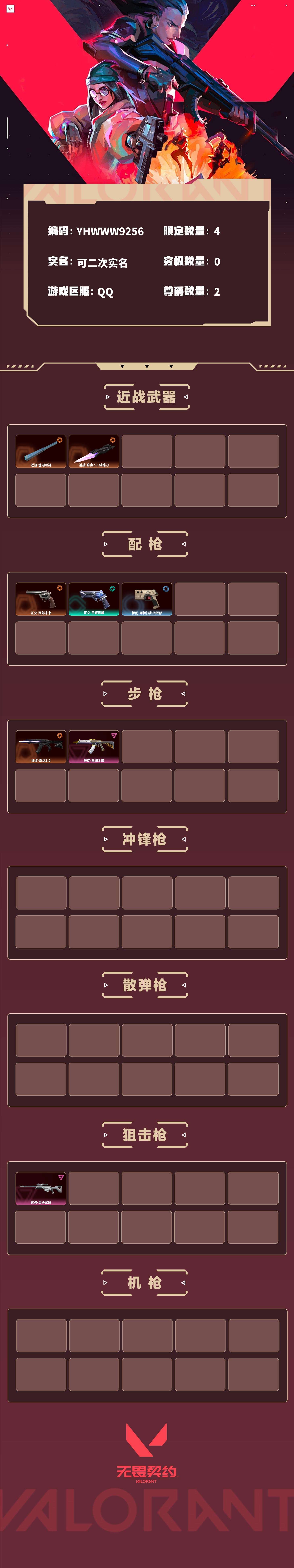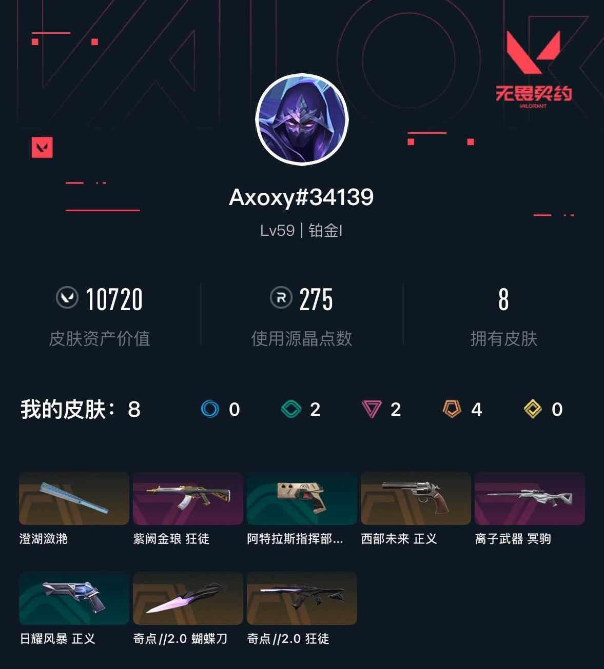 【无畏契约】【yhwww9256】等级:59,已用无畏点10720,已用源晶点275,橙皮:近战-澄湖潋滟|狂徒-奇点2.0|近战-奇点2.0 蝴蝶刀|正义-西部未来__紫皮:冥驹-离子武器|狂徒-紫阙金琅__段位:铂金__绿皮:正义-日耀风暴__蓝皮:标配-阿特拉斯指挥部__英雄:尚勃勒|黑梦|暮蝶|霓虹|壹决|k/o|幽影|夜露|钢锁|奇乐|炼狱|铁臂|贤者|猎枭|钛狐|芮娜|零|捷风|不死鸟|幻棱|雷兹