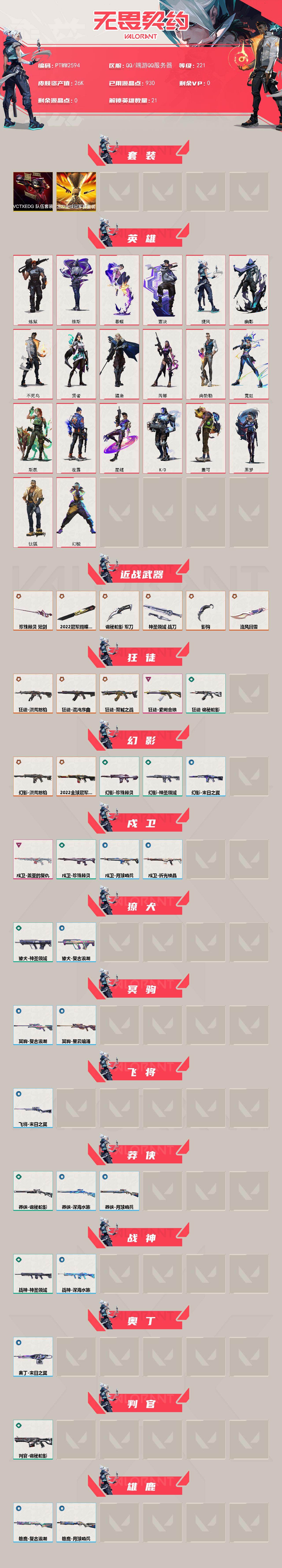 【ptww2594】终极13/卓越4/皮肤61/等级221/段位:白银/2022全球冠军赛套装/vctxedg 队伍套装/幻棱/炼狱/维斯/暮蝶/钛狐/壹决/捷风/幽影/不死鸟/贤者/猎枭/芮娜/尚勃勒/霓虹/斯凯/夜露/星礈/k/o/盖可/黑梦/近战武器-2022全球冠军赛 蝴蝶刀/近战武器-流风回雪/近战武器-影钩/珍珠棘贝-短剑/近战武器-诡秘蛇影 军刀/近战武器-神圣领域 战刀