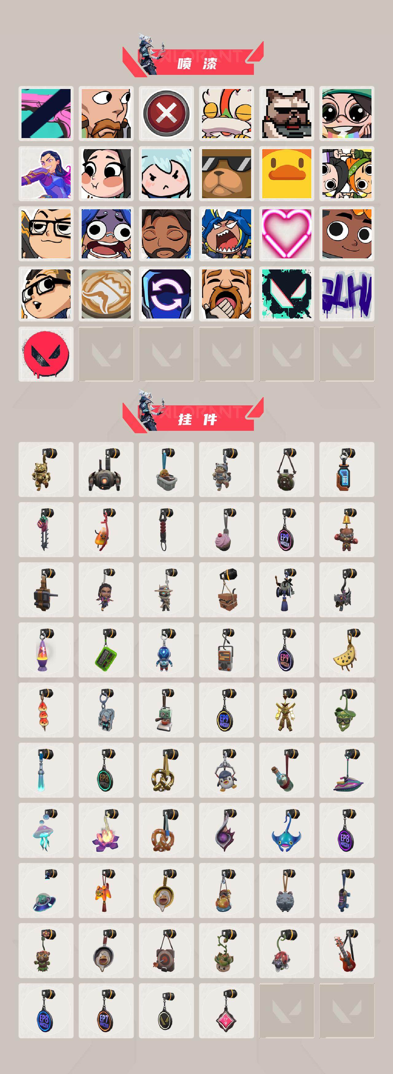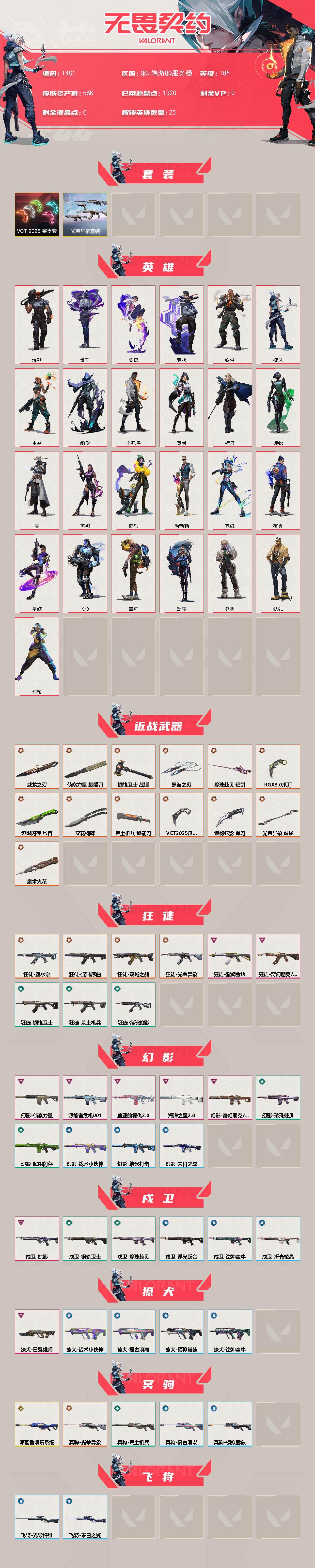 【1481】xl14298 【套装】:光荣异象套装,vct 2025 赛季套装 【英雄】:幻棱,炼狱,维斯,暮蝶,钛狐,壹决,铁臂,捷风,雷兹,幽影,不死鸟,贤者,猎枭,蝰蛇,零,芮娜,奇乐,尚勃勒,霓虹,夜露,星礈,k/o,盖可,黑梦,钢锁 【近战武器】:近战武器-魔术火花,近战武器-光荣异象 歧途,近战武器-穿花蝴蝶,近战武器-侦察力量 蝴蝶刀,近战武器-vct 2025 爪刀,近战武器-rgx 11z pro//3.0 爪刀,近战武器-黑波之刃,近战武器-威龙之刃,近战武器-珍珠棘贝 短剑,近战武器-超限闪存 匕首,近战武器-钢轨卫士 战锤,近战武器-荒土机兵 热能刀,近战武器-诡秘蛇影 军刀,近战武器-魔术火花 【狂徒】:狂徒-混沌序曲,狂徒-双城之战,狂徒-塑水宗,狂徒-光荣异象,狂徒-紫阙金琅,狂徒-奇幻朋克//3.0,狂徒-钢轨卫士,狂徒-荒土机兵,狂徒-诡秘蛇影 【幻影】:幻影-盖亚的复仇//2.0,幻影-源能者危机001,幻影-侦察力量,幻影-海洋之星//2.0,幻影-奇幻朋克//3.0,幻影-超限闪存,幻影-珍珠棘贝,幻影-纳米打击,幻影-战术小伙伴,幻影-末日之翼 【戍卫】:戍卫-掠影,戍卫-钢轨卫士,戍卫-珍珠棘贝,戍卫-浮光跃金,戍卫-逆冲蛮牛,戍卫-折光棱晶 【獠犬】:獠犬-日冕雄师,獠犬-复古浪潮,獠犬-模拟赫兹,獠犬-逆冲蛮牛,獠犬-战术小伙伴 【冥驹】:冥驹-源能者娱乐系统,冥驹-光荣异象,冥驹-荒土机兵,冥驹-复古浪潮,冥驹-模拟赫兹 【飞将】:飞将-光导纤维,飞将-末日之翼 【莽侠】:莽侠-超限闪存,莽侠-诡秘蛇影,莽侠-深海水族 【战神】:战神-浮光跃金,战神-深海水族 【奥丁】:奥丁-纳米打击,奥丁-战术小伙伴,奥丁-末日之翼 【判官】:判官-光荣异象,判官-诡秘蛇影,判官-纳米打击x,判官-神罚 【雄鹿】:雄鹿-复古浪潮,雄鹿-模拟赫兹,雄鹿-逆冲蛮牛 【骇灵】:骇灵-荒土机兵,骇灵-珍珠棘贝,骇灵-浮光跃金,骇灵-光导纤维 【蜂刺】:蜂刺-超限闪存,蜂刺-深海水族,蜂刺-战术小伙伴,蜂刺-折光棱晶 【标配】:标配-光荣异象,标配-超能偶像,标配-荒土机兵,标配-浮光跃金,标配-光导纤维,标配-折光棱晶 【正义】:正义-塑水宗,正义-西部未来,正义-离子武器,正义-超限闪存,正义-复古浪潮,正义-纳米打击 【鬼魅】:鬼魅-盖世英雄,鬼魅-流星兵团,鬼魅-诡秘蛇影,鬼魅-光导纤维,鬼魅-模拟赫兹 【狂怒】:狂怒-钢轨卫士,狂怒-珍珠棘贝,狂怒-逆冲蛮牛 【短炮】:短炮-钢轨卫士,短炮-深海水族,短炮-末日之翼 【卡面】:进入射程 卡面,分崩离析 卡面,纳米打击 卡面,抑制技术 卡面,激斗汉堡 卡面,瓦娃脸雪糕 p2 卡面,从黄昏到黎明 卡面,荒土机兵 卡面,银弹猎手 卡面,逆冲蛮牛 卡面,《双城之战》拥抱 卡面,精灵大战 卡面,欢迎来到底城 卡面,南瓜盛典 卡面,唱片的故事 卡面,钢弓与箭弦 卡面,无畏契约:暮蝶 卡面,排除故障 卡面,战术桌游 卡面,悠享食光 卡面,修车达人 卡面,模拟赫兹 卡面,浮光跃金 卡面,超限闪存 卡面,维斯工牌 卡面,正义的化身 卡面,终章:生意人麦宝 卡面,铁之华 卡面,时间到 卡面,最高舞台 卡面,声感陷阱设计图 卡面,梦幻奶茶 卡面,终章:打造专属狂徒 卡面,趁热吃 卡面,源能反应 卡面,零点嗅探设计图 卡面,终章:瓦娃脸雪糕 卡面,表象之下 卡面,虹吸式咖啡壶 卡面,源能者美容 卡面,脚踝终结者 卡面 ,夜班 卡面,瓦娃脸雪糕 卡面 ,沙雕爆能器 卡面,无畏契约go!第一卷:芮娜 卡面,深海水族 卡面,珍珠棘贝 卡面,复古浪潮 卡面,盖可工牌 卡面,清除名单 卡面,无畏契约go!第一卷:零 卡面,终章:同步耍酷 卡面,龍记 卡面,化茧成蝶 卡面,比比看谁快? 卡面,无垠星环 卡面,蝰蛇vs幽影 卡面,势不可挡//盖可 卡面,逆向独行 卡面 ,同步耍酷 卡面,完美调谐 卡面 ,没有什么能逃过我的眼睛 卡面,光导纤维 卡面,战术小伙伴 卡面,钢轨卫士 卡面,暗呛 卡面,无畏契约go!第一卷:贤者 卡面,铁臂设计图 卡面,代号红色 卡面,冰淇淋店 卡面,新兵报到 卡面,v契约 卡面,无畏契约 卡面 【喷漆】:小小心意 喷漆,战“素”兔 喷漆,宇宙的指引 喷漆,请求重启 喷漆,逆冲蛮牛 喷漆,纳米打击 喷漆,鼻尖上的蝴蝶 喷漆,简笔画黯兽 喷漆,独守蝰腹 喷漆,他们将落荒而逃 喷漆,通缉:战术企鹅 喷漆,荒土机兵 喷漆,别挡我吃球! 喷漆,嗨宝南瓜灯 喷漆,嘭! 喷漆,都算到了 喷漆,控场勿近 喷漆,皮蛋呼呼 喷漆,像素星礈 喷漆,图谋不轨的零 喷漆,伤心心 喷漆,小丑猫 喷漆,模拟赫兹 喷漆,高丽风情小熊 喷漆,蹲到一个 喷漆,全力集中 喷漆,超限闪存 喷漆,rua一下 喷漆,熊抱 喷漆,高丽风情小虎 喷漆,记在小本本 喷漆,防弹企鹅 喷漆,高丽风情小蛙 喷漆,超级粉丝 喷漆,捷风差距 喷漆,惊声尖叫 喷漆,审判之爪 喷漆,拼一呛 喷漆,我觉得不行 喷漆,我的刀呢? 喷漆,情绪控制 喷漆,哨卫滑步 喷漆,倒吸一口凉气 喷漆,uwu 喷漆,新潮流 喷漆,逮到一个 喷漆,一个人的孤岛 喷漆,双人比心 喷漆,不予置评 喷漆,三熊合一 喷漆,要喝完噢! 喷漆,双击点赞 喷漆,珍珠棘贝 喷漆,深海水族 喷漆,禁止标配 喷漆 ,铁臂尴尬 喷漆,买装还是存钱 喷漆,醒狮贺春 喷漆,关门放狗 喷漆,萌化了 喷漆,无畏契约go!第一卷:芮娜 喷漆,辣得好下饭 喷漆,飓刃涂鸦 喷漆 ,旅行小熊 喷漆,战术小伙伴 喷漆,又一个梦幻组合 喷漆,是大风刮来的 喷漆 ,静电火花 喷漆 ,今天的潮声甚是喧嚣 喷漆 ,请你冷静点 喷漆 ,蕊形灯 喷漆,这是你掉的吗? 喷漆,省钱大师 喷漆 ,皇冠拉花 喷漆,该转点了 喷漆,老铁困了 喷漆,胜利属于无畏契约 喷漆,glhf 喷漆,无畏