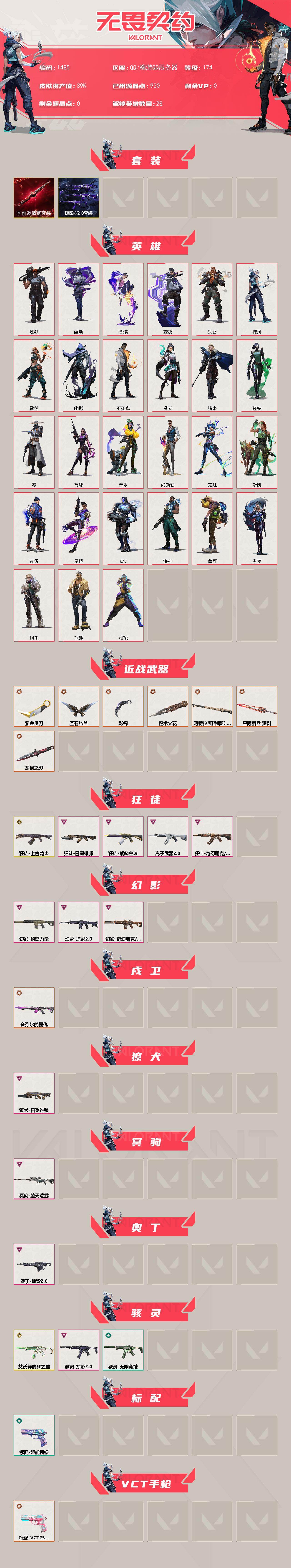【1485】xl37816 【套装】:无畏契约季前邀请赛套装,掠影//2.0套装 【英雄】:幻棱,炼狱,维斯,暮蝶,钛狐,壹决,铁臂,捷风,雷兹,幽影,不死鸟,贤者,猎枭,蝰蛇,零,芮娜,奇乐,尚勃勒,霓虹,斯凯,夜露,星礈,k/o,海神,盖可,黑梦,钢锁 【近战武器】:近战武器-无畏契约季前邀请赛 悲悯之刃,近战武器-魔术火花,近战武器-影钩,近战武器-紫金爪刀,近战武器-圣石匕首,近战武器-阿特拉斯指挥部 甩棍,近战武器-星际猎兵 短剑,近战武器-魔术火花 【狂徒】:狂徒-上古龙炎,狂徒-日冕雄师,狂徒-紫阙金琅,狂徒-离子武器//2.0,狂徒-奇幻朋克//3.0 【幻影】:幻影-侦察力量,幻影-掠影//2.0,幻影-奇幻朋克//3.0 【戍卫】:戍卫-多弥尔的复仇 【獠犬】:獠犬-日冕雄师 【冥驹】:冥驹-堕天遗武 【奥丁】:奥丁-掠影//2.0 【骇灵】:骇灵-艾沃莉的梦之翼,骇灵-掠影//2.0,骇灵-无限竞技 【标配】:标配-超能偶像 【vct手呛】:标配-vct25 x blg 【正义】:正义-掠影 【鬼魅】:鬼魅-掠影//2.0,鬼魅-星云暗涌 【短炮】:短炮-天才少女 【卡面】:《双城之战》拥抱 卡面,精灵大战 卡面,欢迎来到底城 卡面,南瓜盛典 卡面,钢弓与箭弦 卡面,无畏契约:暮蝶 卡面,修车达人 卡面,热舞环节 卡面,正义的化身 卡面,终章:生意人麦宝 卡面,铁之华 卡面,时间到 卡面,最高舞台 卡面,声感陷阱设计图 卡面,红鳞松叶 卡面,clutch 卡面,梦幻奶茶 卡面,无畏契约go!第一卷:芮娜 卡面,无畏契约go!第一卷:零 卡面,化茧成蝶 卡面,《双城之战》金克丝 卡面,势不可挡//盖可 卡面,无畏契约go!第一卷:贤者 卡面,钢锁vs盖可 卡面,别冒尖 卡面,代号红色 卡面,新兵报到 卡面,v契约 卡面,无畏契约 卡面 【喷漆】:嘭! 喷漆,都算到了 喷漆,控场勿近 喷漆,伤心心 喷漆,熊抱 喷漆,超级粉丝 喷漆,捷风差距 喷漆,惊声尖叫 喷漆,拼一呛 喷漆,皮蛋萌舞 喷漆,霓光四射 喷漆,买装还是存钱 喷漆,酷熊冲浪 喷漆,红鳞 喷漆,无畏契约go!第一卷:奇乐 喷漆,胜利属于无畏契约 喷漆,glhf 喷漆,无畏契约 喷漆 【挂饰】:v25第三幕:超凡 挂饰,《双城之战》小蛋糕 挂饰,第九季//第三幕 纪念币 挂饰,无畏契约go!第一卷 芮娜 挂饰,无畏契约go!第一卷 零 挂饰,熔岩灯 挂饰,第九季//第二幕 纪念币 挂饰,终章:这瓜保熟 挂饰,糖葫芦 挂饰,袖珍捷风 挂饰,迷你浓缩 挂饰,第九季//第一幕 纪念币 挂饰,天外飞客 挂饰,《双城之战》魄罗 挂饰,无畏契约 纪念币 挂饰