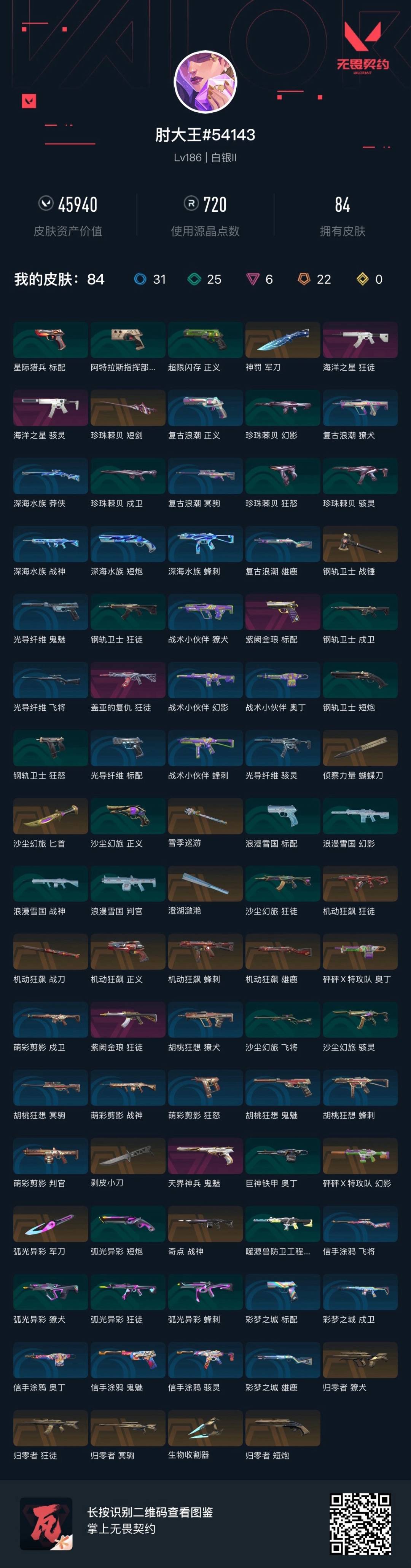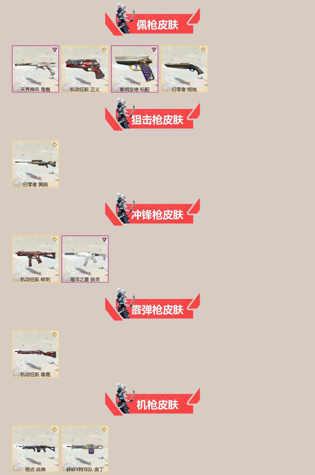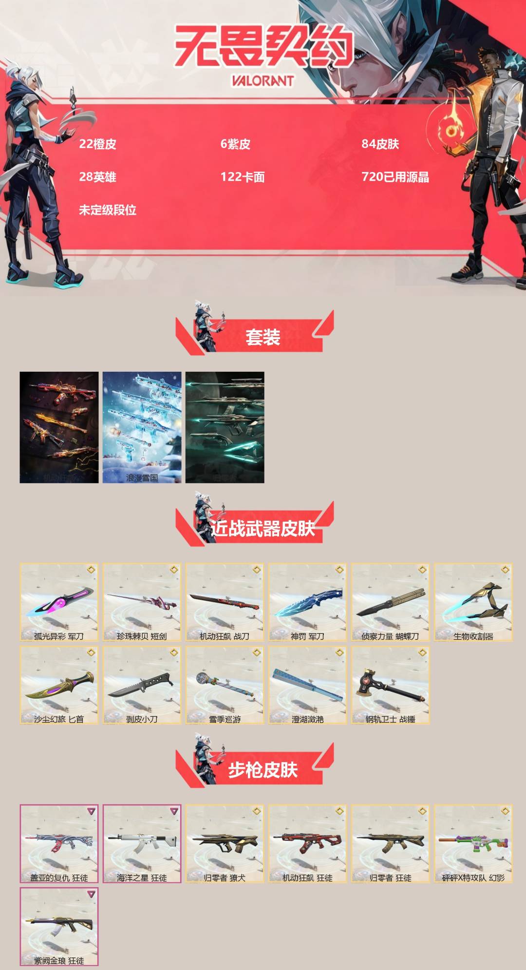 22橙皮 6紫皮 84皮肤 28英雄 122卡面 720已用源晶 未定级段位 【套装】机动狂飙套装归零者套装浪漫雪国套装 【近战武器皮肤】战锤-钢轨卫士蝴蝶刀-侦察力量剥皮小刀机动狂飙战刀短剑-珍珠棘贝澄湖潋滟匕首-沙尘幻旅雪季巡游军刀-弧光异彩军刀-神罚生物收割器 【佩呛