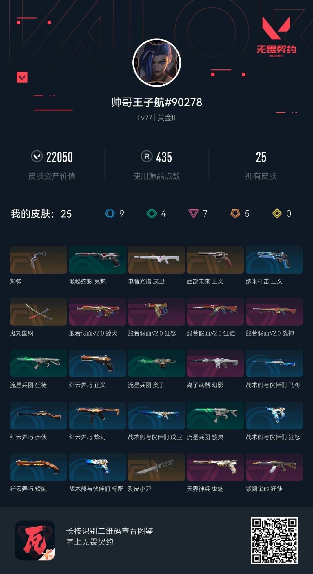 [16528927]5橙皮 7紫皮 25皮肤 22英雄 61卡面 435已用源晶 未定级段位 【套装】般若假面//2.0套装 【近战武器皮肤】鬼丸国纲影钩剥皮小刀 【佩呛皮肤】正义-西部未来狂怒-般若假面//2.0鬼魅-天界神兵 【步呛皮肤】獠犬-般若假面//2.0狂徒-般若假面//2.0戍卫-电音光谱狂徒-紫阙金琅幻影-离子武器 【机呛皮肤】战神-般若假面//2.0 【挂饰】神中神挂饰传世莲华挂饰第九季超凡挂饰云开见日挂饰双城之战小蛋糕挂饰迷你机甲挂饰