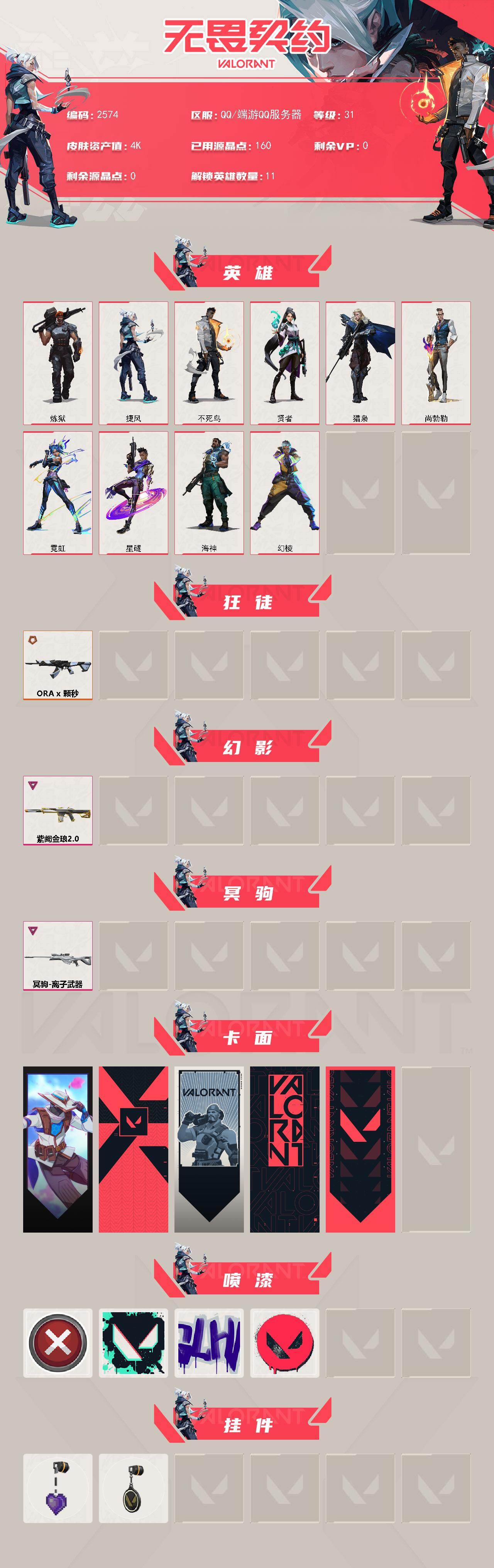 [16564925]【英雄】:幻棱,炼狱,捷风,不死鸟,贤者,猎枭,尚勃勒,霓虹,星礈,海神 【狂徒】:狂徒-a x 颗秒 【幻影】:幻影-紫阙金琅//2.0 【冥驹】:冥驹-离子武器 【卡面】:无畏契约go!第一卷:零 卡面,代号红色 卡面,新兵报到 卡面,v契约 卡面,无畏契约 卡面 【喷漆】:买装还是存钱 喷漆,胜利属于无畏契约 喷漆,glhf 喷漆,无畏契约 喷漆 【挂饰】:薰衣草之心 挂饰,无畏契约 纪念币 挂饰