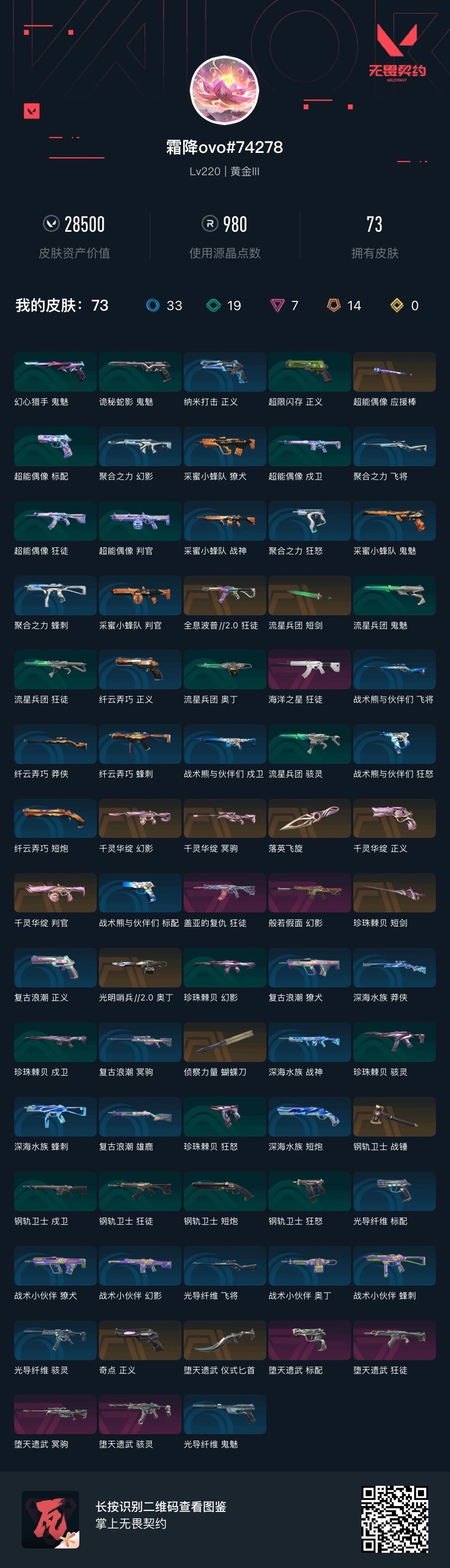 [16505566]14橙皮 7紫皮 73皮肤 28英雄 135卡面 980已用源晶 黄金段位 【套装】千灵华绽套装堕天遗武套装 【近战武器皮肤】战锤-钢轨卫士短剑-流星兵团堕天遗武 仪式匕首蝴蝶刀-侦察力量短剑-珍珠棘贝超能偶像 应援棒落英飞旋 【佩呛皮肤】正义-奇点正义-千灵华绽标配-堕天遗武 【冲锋呛皮肤】骇灵-堕天遗武 【霰弹呛皮肤】判官-千灵华绽 【步呛皮肤】狂徒-海洋之星狂徒-盖亚的复仇狂徒-全息波普//2.0狂徒-堕天遗武幻影-千灵华绽幻影-般若假面 【狙击呛皮肤】冥驹-堕天遗武冥驹-千灵华绽 【机呛皮肤】奥丁-光明哨兵2.0 【挂饰】袖珍捷风挂饰超能偶像挂饰千灵华绽挂饰神中神挂饰打不烂的挂饰传世莲华挂饰v26第一幕纪念币 挂饰冬日絮语挂饰糖葫芦挂饰云开见日挂饰幸运中国结挂饰双城之战小蛋糕挂饰终章ko小金人挂饰迷你机甲挂饰