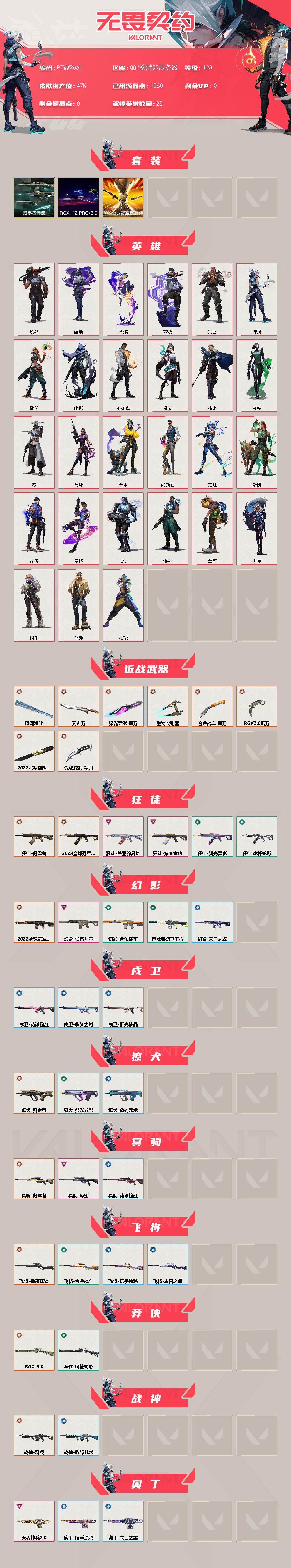 【套装】:2022全球冠军赛套装,rgx 11z pro//3.0套装,归零者套装 【英雄】:幻棱,炼狱,维斯,暮蝶,钛狐,壹决,铁臂,捷风,雷兹,幽影,不死鸟,贤者,猎枭,蝰蛇,零,芮娜,奇乐,尚勃勒,霓虹,斯凯,夜露,星礈,k/o,海神,盖可,黑梦,钢锁 【近战武器】:近战武器-2022全球冠军赛 蝴蝶刀,近战武器-rgx 11z pro//3.0 爪刀,近战武器-澄湖潋滟,近战武器-合金