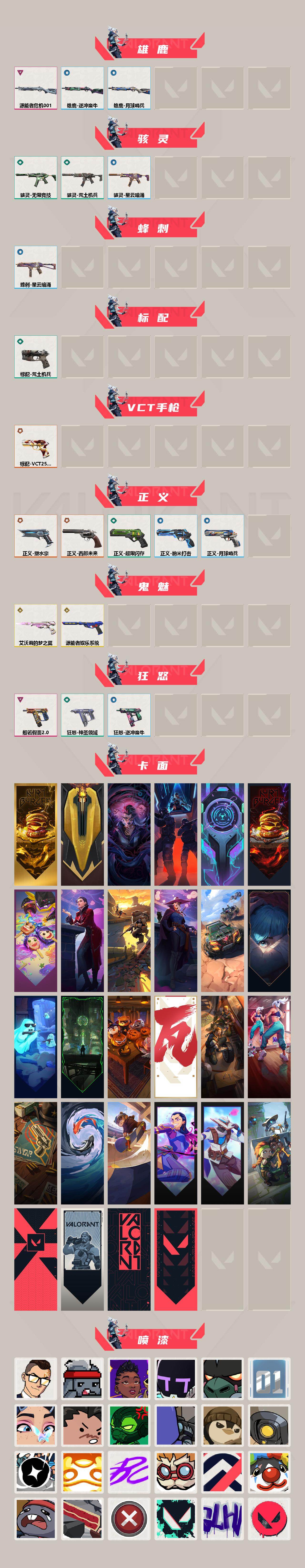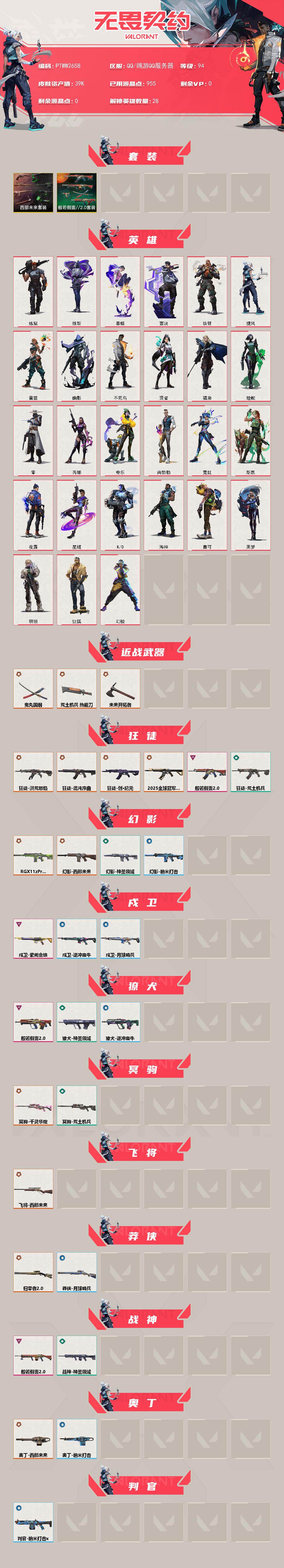 【套装】:西部未来套装,般若假面//2.0套装 【英雄】:幻棱,炼狱,维斯,暮蝶,钛狐,壹决,铁臂,捷风,雷兹,幽影,不死鸟,贤者,猎枭,蝰蛇,零,芮娜,奇乐,尚勃勒,霓虹,斯凯,夜露,星礈,k/o,海神,盖可,黑梦,钢锁 【近战武器】:近战武器-鬼丸国纲,近战武器-未来开拓者,近战武器-荒土机兵 热能刀 【狂徒】:狂徒-2025全球冠军赛,狂徒-洪荒怒焰,狂徒-混沌序曲,狂徒-创·纪元,狂徒