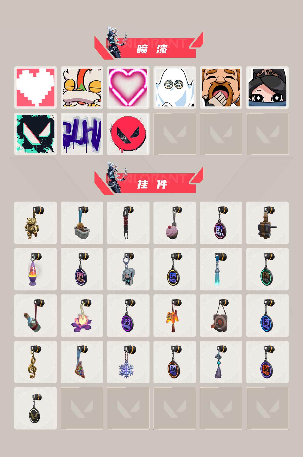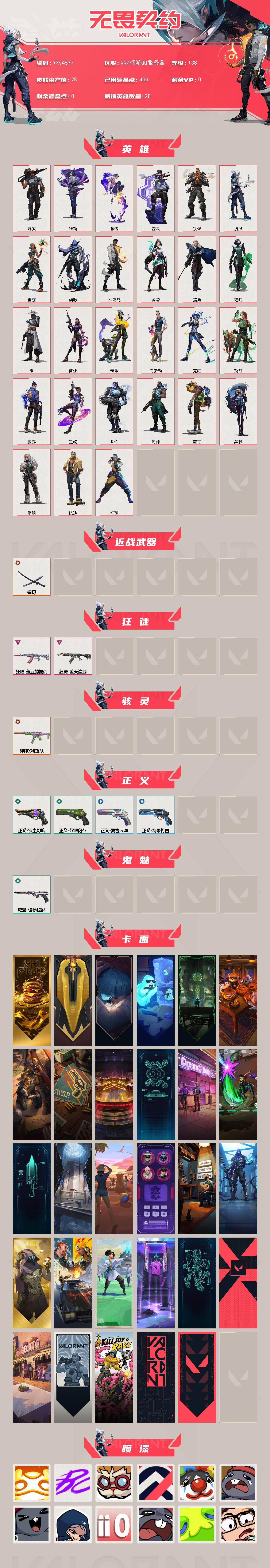 【英雄】:幻棱,炼狱,维斯,暮蝶,钛狐,壹决,铁臂,捷风,雷兹,幽影,不死鸟,贤者,猎枭,蝰蛇,零,芮娜,奇乐,尚勃勒,霓虹,斯凯,夜露,星礈,k/o,海神,盖可,黑梦,钢锁 【近战武器】:近战武器-镭切 【狂徒】:狂徒-堕天遗武,狂徒-盖亚的复仇 【骇灵】:骇灵-砰砰x特攻队 【正义】:正义-超限闪存,正义-沙尘幻旅,正义-复古浪潮,正义-纳米打击 【鬼魅】:鬼魅-诡秘蛇影 【卡面】:终章: