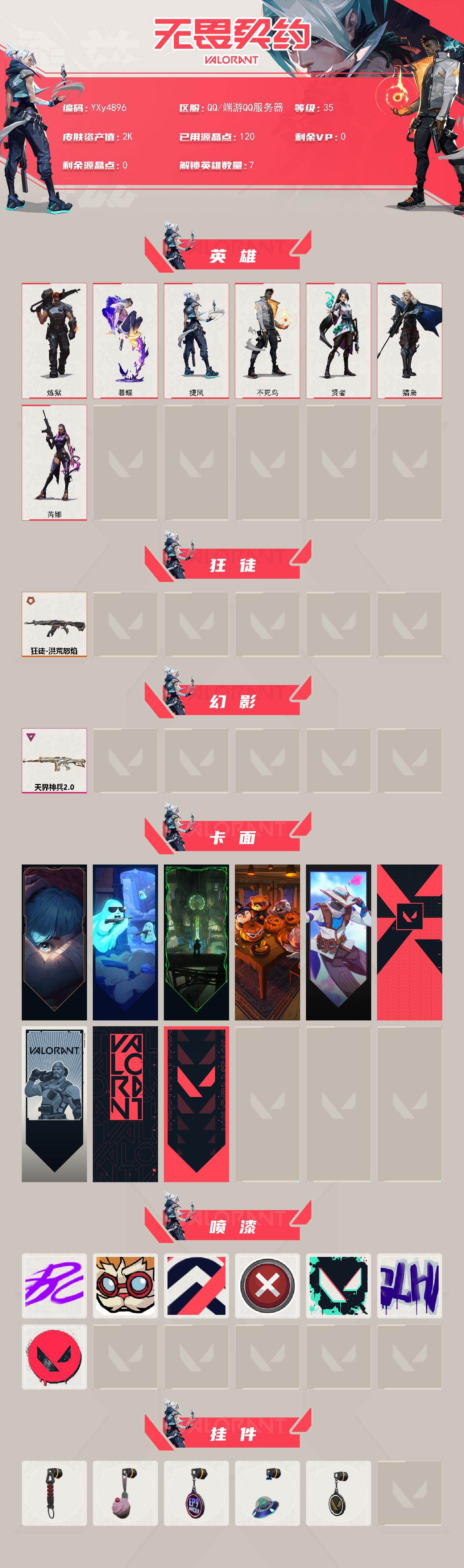 【英雄】:炼狱,暮蝶,捷风,不死鸟,贤者,猎枭,芮娜 【狂徒】:狂徒-洪荒怒焰 【幻影】:幻影-天界神兵//2.0 【卡面】:《双城之战》拥抱 卡面,精灵大战 卡面,欢迎来到底城 卡面,南瓜盛典 卡面,无畏契约go!第一卷:零 卡面,代号红色 卡面,新兵报到 卡面,v契约 卡面,无畏契约 卡面 【喷漆】:嘭! 喷漆,都算到了 喷漆,控场勿近 喷漆,买装还是存钱 喷漆,胜利属于无畏契约 喷漆,g