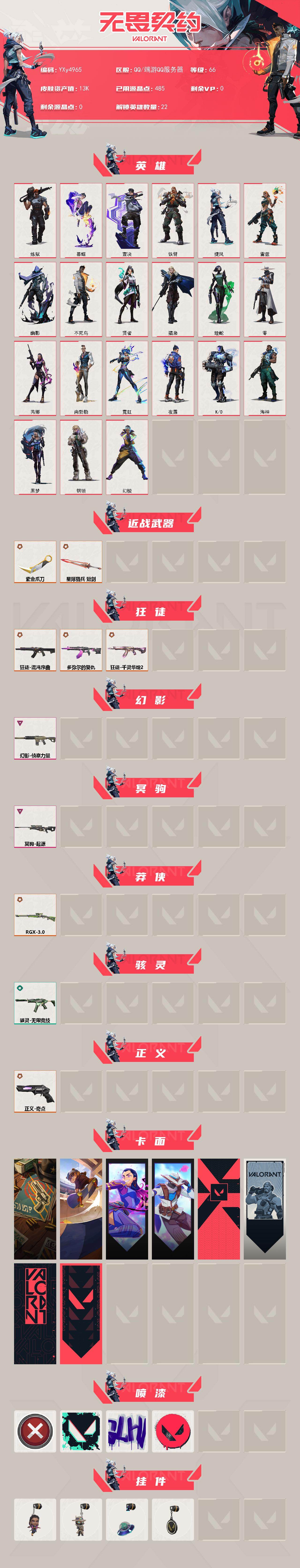 【1.3w库存紫金爪刀.混沌.多弥尔.莲花ak.侦查.起源狙.奇点正义】yxy4965【无二次】【因赛季更新游戏段付以上号为准!】 【英雄】:幻棱,炼狱,暮蝶,壹决,铁臂,捷风,雷兹,幽影,不死鸟,贤者,猎枭,蝰蛇,零,芮娜,尚勃勒,霓虹,夜露,k/o,海神,黑梦,钢锁 【近战武器】:近战武器-紫金爪刀,近战武器-星际猎兵 短剑 【狂徒】:狂徒-混沌序曲,狂徒-多弥尔的复仇,狂徒-千灵华绽//2.0 【幻影】:幻影-侦察力量 【冥驹】:冥驹-起源 【莽侠】:莽侠-rgx 11z pro//3.0 【骇灵】:骇灵-无限竞技 【正义】:正义-奇点 【卡面】:正义的化身 卡面,clutch 卡面,无畏契约go!第一卷:芮娜 卡面,无畏契约go!第一卷:零 卡面,代号红色 卡面,新兵报到 卡面,v契约 卡面,无畏契约 卡面 【喷漆】:买装还是存钱 喷漆,胜利属于无畏契约 喷漆,glhf 喷漆,无畏契约 喷漆 【挂饰】:无畏契约go!第一卷 芮娜 挂饰,无畏契约go!第一卷 零 挂饰,天外飞客 挂饰,无畏契约 纪念币 挂饰