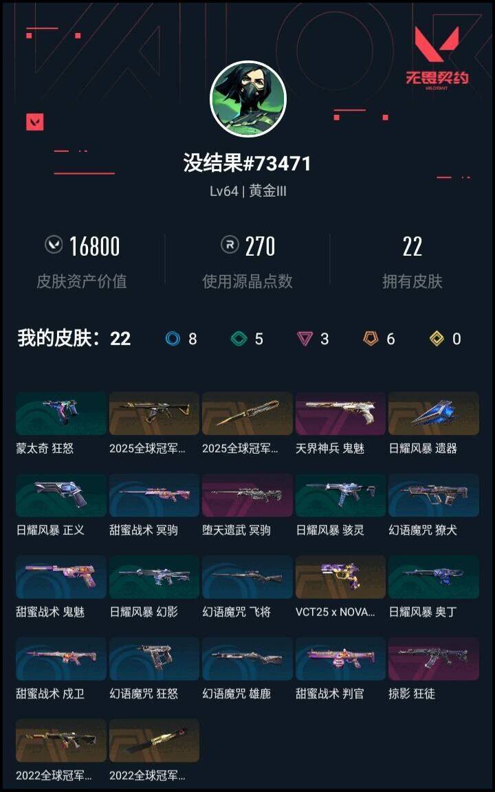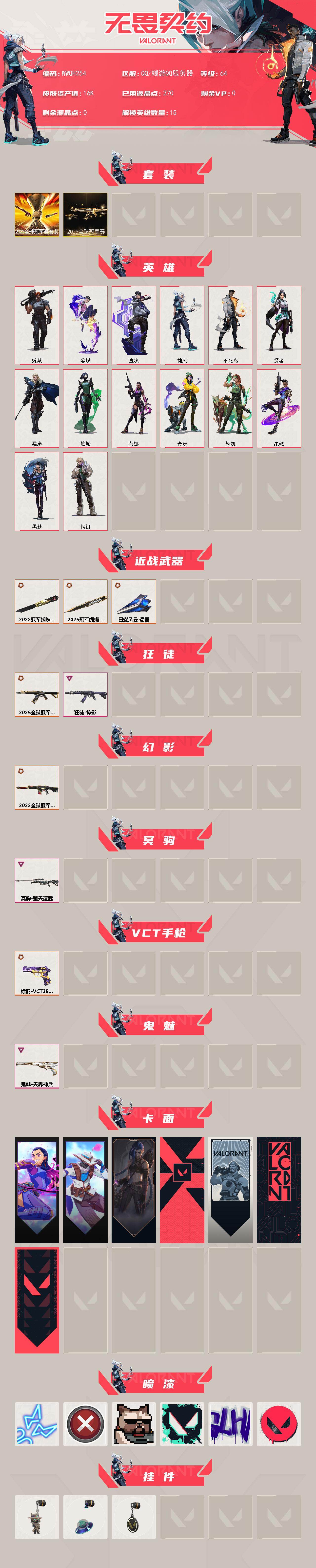 【wwqh254】终极6/卓越3/皮肤22/等级64/段位:黄金/2025全球冠军赛套装/2022全球冠军赛套装/炼狱/暮蝶/壹决/捷风/不死鸟/贤者/猎枭/蝰蛇/芮娜/奇乐/斯凯/星礈/黑梦/钢锁/近战武器-2025全球冠军赛 蝴蝶刀/近战武器-2022全球冠军赛 蝴蝶刀/近战武器-日耀风暴 遗器/狂徒-2025全球冠军赛/狂徒-掠影/幻影-2022全球冠军赛/冥驹-堕天遗武/标配-vct25 x nova/鬼魅-天界神兵/无畏契约go!第一卷:芮娜 卡面/无畏契约go!第一卷:零 卡面/《双城之战》金克丝 卡面/代号红色 卡面/新兵报到 卡面/v契约 卡面/无畏契约 卡面/霓光四射 喷漆/买装还是存钱 喷漆/关门放狗 喷漆/胜利属于无畏契约 喷漆/glhf 喷漆/无畏契约 喷漆/无畏契约go!第一卷 零 挂饰/天外飞客 挂饰/无畏契约 纪念币 挂饰