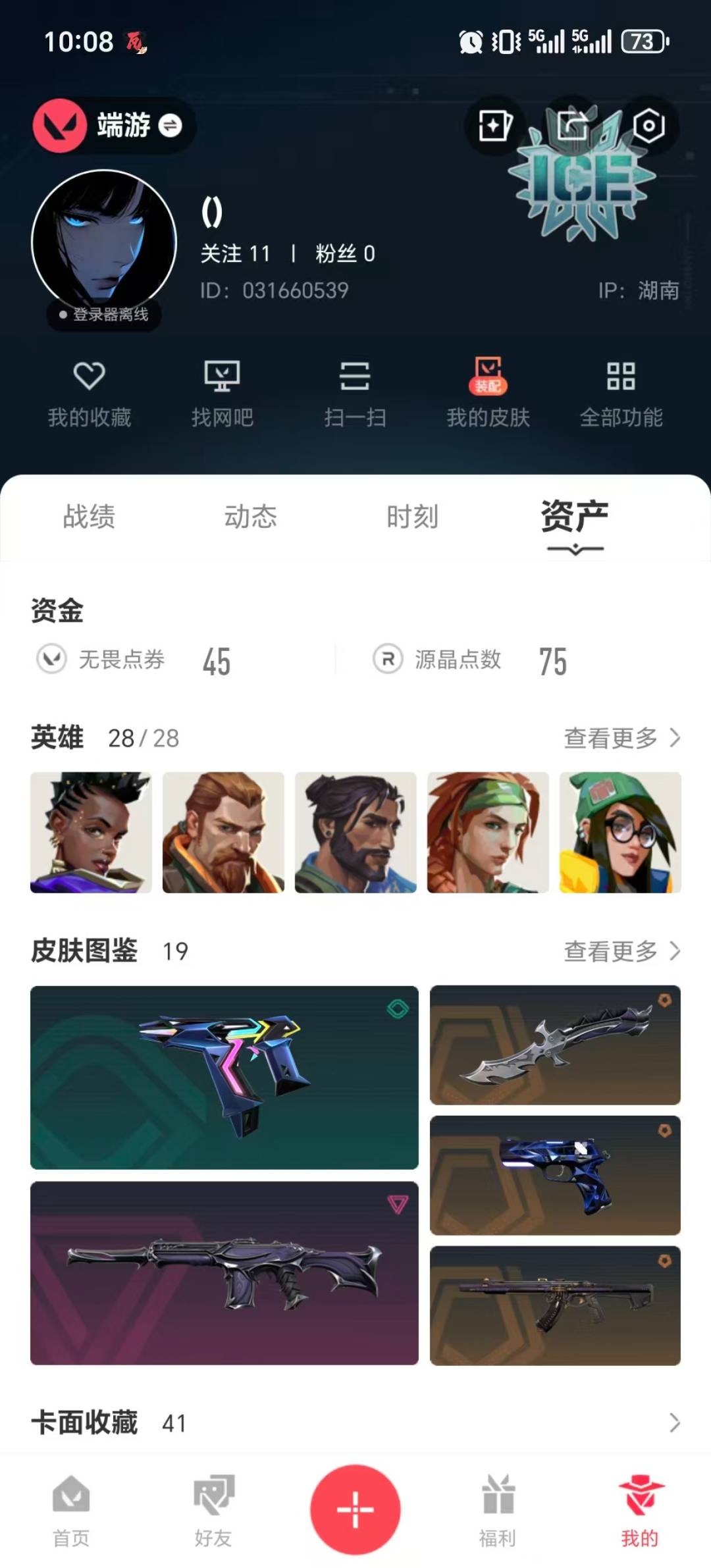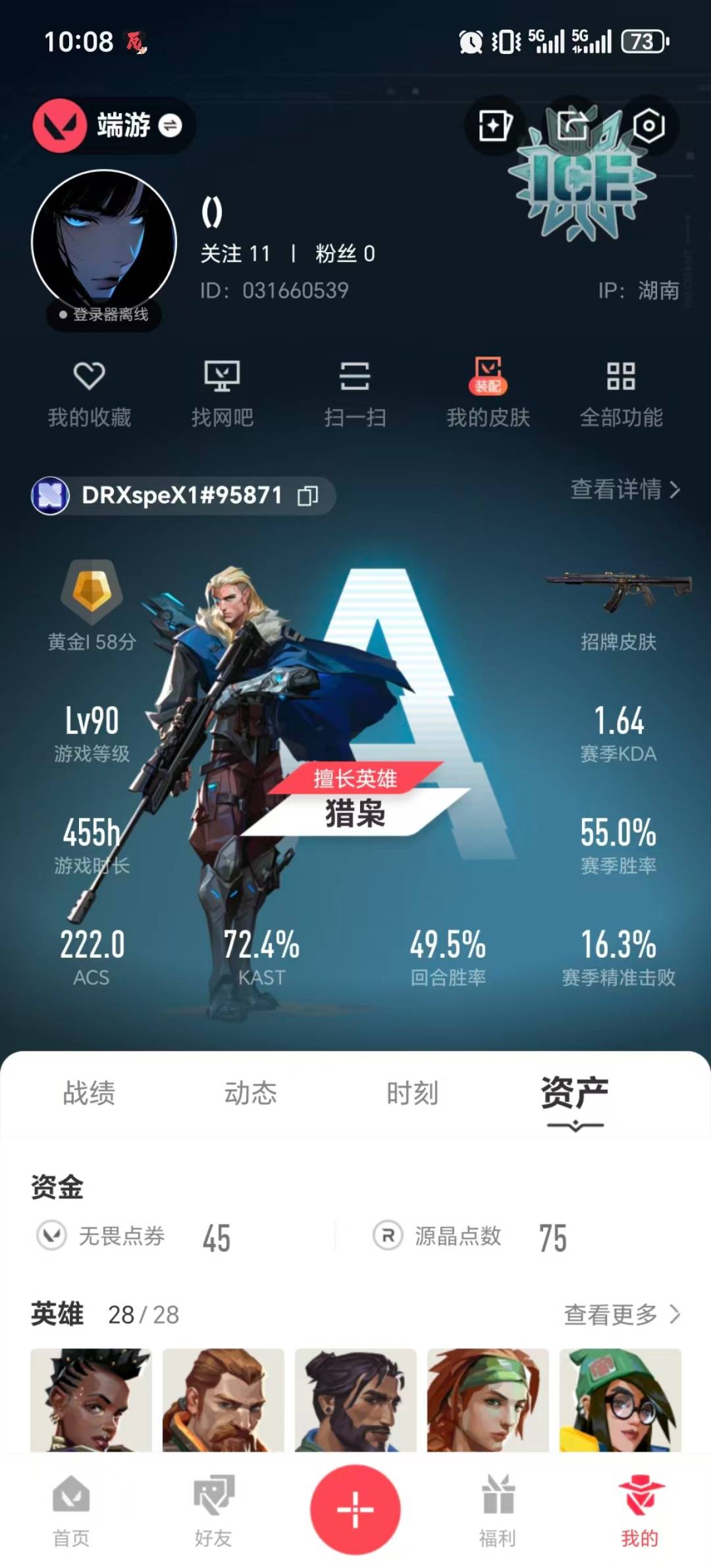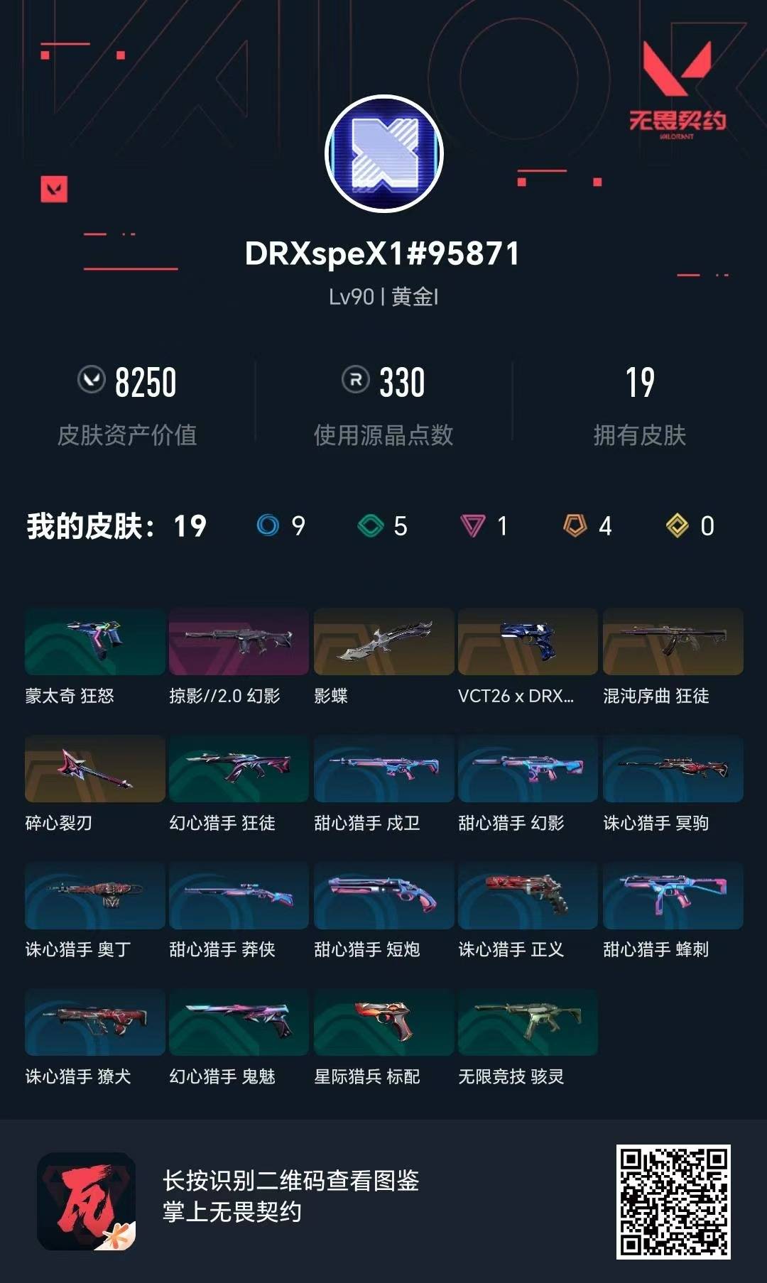 4橙皮 1紫皮 19皮肤 28英雄 41卡面 330已用源晶 黄金段位 【近战武器皮肤】碎心裂刃影蝶-掠影//3.0 【佩呛皮肤】蒙太奇 狂怒标配-vct26 x drx 【步呛皮肤】幻影-掠影2.0狂徒-混沌序曲 【挂饰】v26第一幕纪念币 挂饰h2-oh!挂饰vctxdrx挂饰