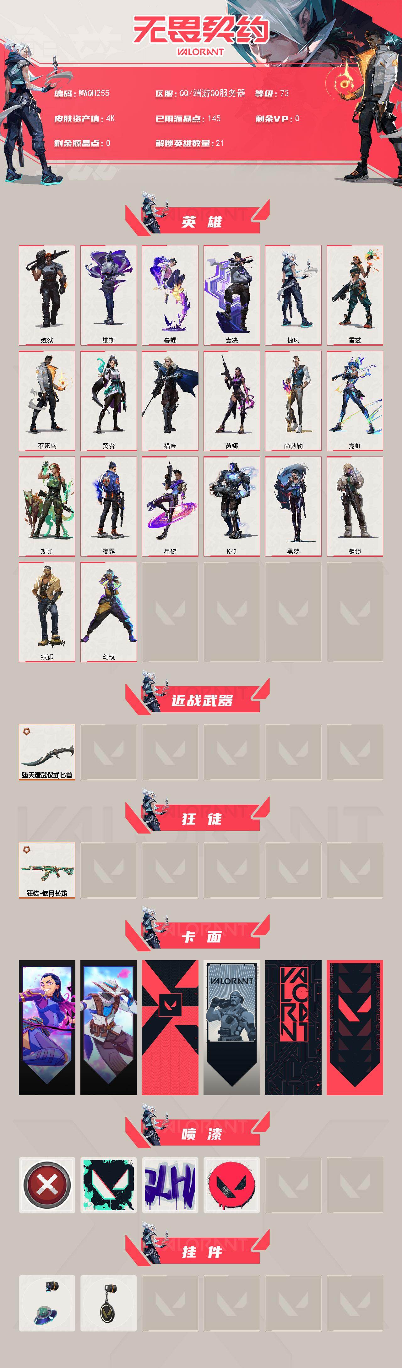 【wwqh255】终极3/皮肤15/等级73/段位:黄金/幻棱/炼狱/维斯/暮蝶/钛狐/壹决/捷风/雷兹/不死鸟/贤者/猎枭/芮娜/尚勃勒/霓虹/斯凯/夜露/星礈/k/o/黑梦/钢锁/近战武器-堕天遗武 仪式匕首/狂徒-偃月苍龙/无畏契约go!第一卷:芮娜 卡面/无畏契约go!第一卷:零 卡面/代号红色 卡面/新兵报到 卡面/v契约 卡面/无畏契约 卡面/买装还是存钱 喷漆/胜利属于无畏契约 喷漆/glhf 喷漆/无畏契约 喷漆/天外飞客 挂饰/无畏契约 纪念币 挂饰