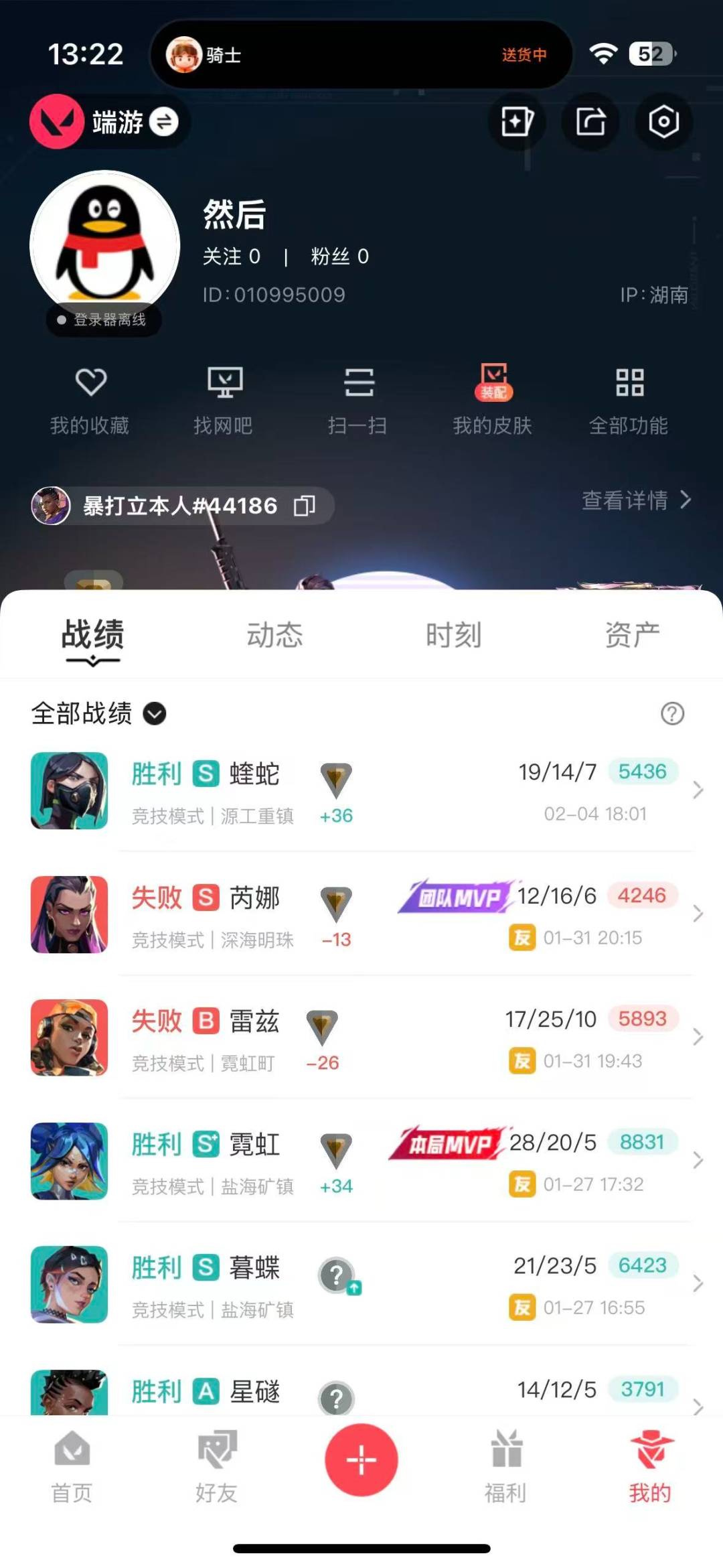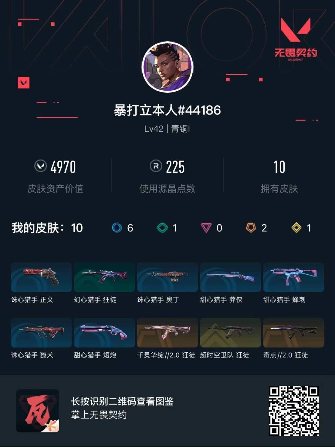 2橙皮 1金皮 10皮肤 14英雄 29卡面 225已用源晶 青铜段位 【步呛皮肤】狂徒-奇点//2.0狂徒-千灵华绽//2.0狂徒-超时空卫队 【挂饰】v26第一幕纪念币 挂饰v25第三幕:黑铁 挂饰