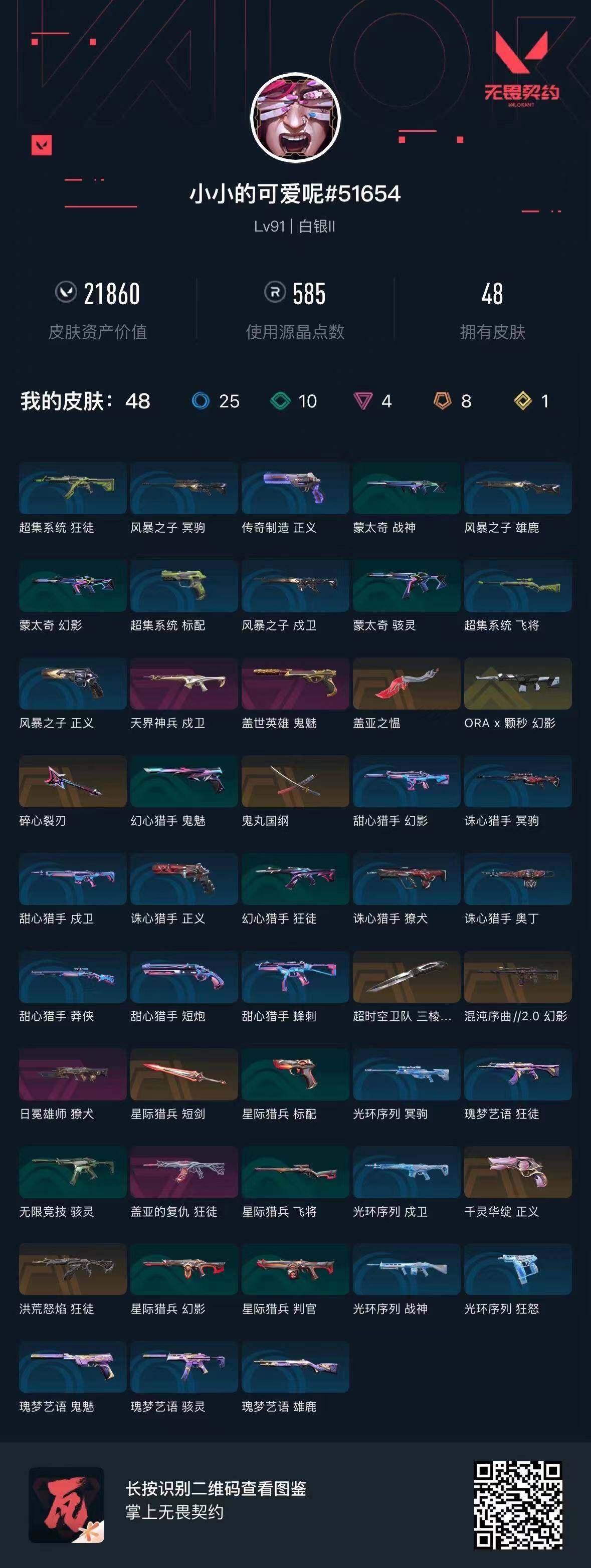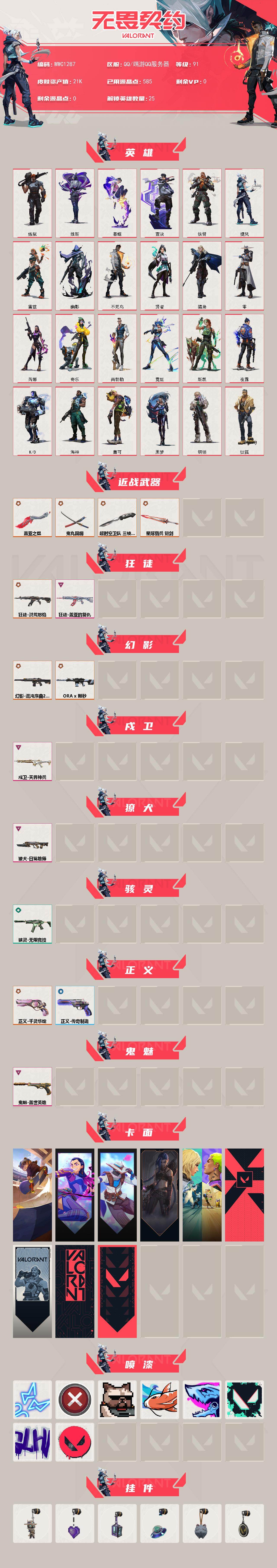 【wwc1287】终极8/传奇1/卓越4/皮肤48/等级91/段位:白银/炼狱/维斯/暮蝶/钛狐/壹决/铁臂/捷风/雷兹/幽影/不死鸟/贤者/猎枭/零/芮娜/奇乐/尚勃勒/霓虹/斯凯/夜露/k/o/海神/盖可/黑梦/钢锁/近战武器-超时空卫队 三棱军刺/近战武器-鬼丸国纲/近战武器-盖亚之愠/近战武器-星际猎兵 短剑/狂徒-洪荒怒焰/狂徒-盖亚的复仇/幻影-混沌序曲//2.0/幻影-a x 颗秒/戍卫-天界神兵/獠犬-日冕雄师/骇灵-无限竞技/正义-千灵华绽/正义-传奇制造/鬼魅-盖世英雄/clutch 卡面/无畏契约go!第一卷:芮娜 卡面/无畏契约go!第一卷:零 卡面/《双城之战》金克丝 卡面/钢锁vs盖可 卡面/代号红色 卡面/新兵报到 卡面/v契约 卡面/无畏契约 卡面/霓光四射 喷漆/买装还是存钱 喷漆/关门放狗 喷漆/红鳞 喷漆/暴走萝莉 喷漆/胜利属于无畏契约 喷漆/glhf 喷漆/无畏契约 喷漆/无畏契约go!第一卷 零 挂饰/薰衣草之心 挂饰/动力机箱 挂饰/天外飞客 挂饰/《双城之战》魄罗 挂饰/无畏契约 纪念币 挂饰