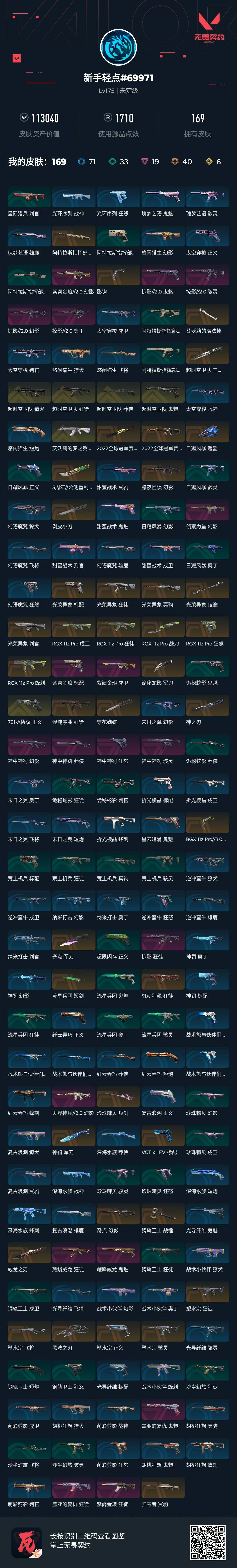 [16030400]s193262 (2022全球冠军赛套装/超时空卫队套装/塑水宗套装/光荣异象套装/掠影//2.0套装/rgx-11z-pro套装/神中神罚套装/耀鳞威龙套装)无畏契约/175等级/未定级段位/27英雄/169皮肤/资产113040/已使用r点1710/剩余r点10/ 混沌序曲-狂徒,黯夜怪谈-幻影,机动狂飙-狂徒,奇点-幻影,艾沃莉的梦之翼-狂徒,紫阙金琅//2.0-幻影,天界神兵//2.0-幻影,紫阙金琅-戍卫,紫阙金琅-狂徒,盖亚的复仇-狂徒,侦察力量-幻影,掠影-狂徒,阿特拉斯指挥部-甩棍,日耀风暴-遗器,5周年//公测重制版-苍龙之刃,诡秘蛇影-军刀,流星兵团-短剑,珍珠棘贝-短剑,神罚-军刀,钢轨卫士-战锤,rgx-11z-pro//3.0-爪刀,奇点-军刀,剥皮小刀,艾沃莉的魔法棒,穿花蝴蝶,归零者-冥驹,vct-x-lev-标配,781-a协议-正义,紫阙金琅-标配,盖亚的复仇-鬼魅