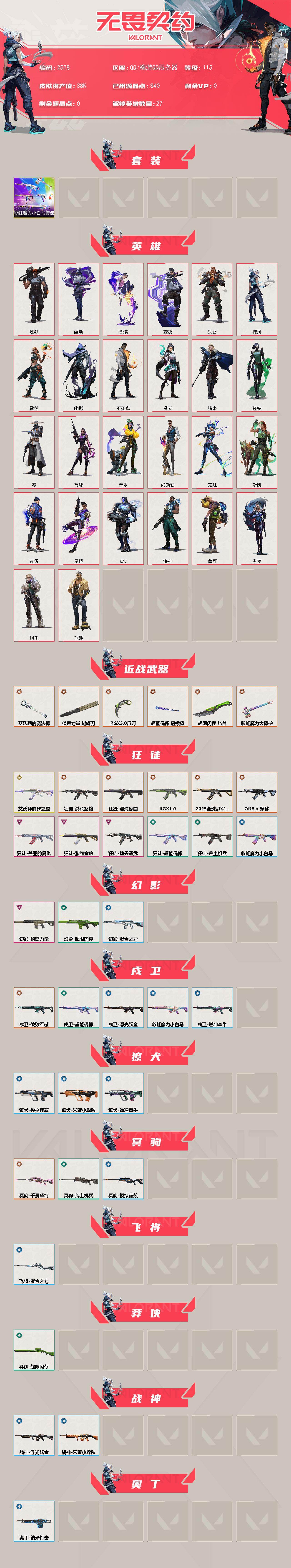 [16580818]【套装】:彩虹魔力小白马套装 【英雄】:炼狱,维斯,暮蝶,钛狐,壹决,铁臂,捷风,雷兹,幽影,不死鸟,贤者,猎枭,蝰蛇,零,芮娜,奇乐,尚勃勒,霓虹,斯凯,夜露,星礈,k/o,海神,盖可,黑梦,钢锁 【近战武器】:近战武器-侦察力量 蝴蝶刀,近战武器-rgx 11z pro//3.0 爪刀,近战武器-艾沃莉的魔法棒,近战武器-彩虹魔力大棒槌,近战武器-超能偶像 应援棒,近战武器-超限闪存 匕首 【狂徒】:狂徒-艾沃莉的梦之翼,狂徒-2025全球冠军赛,狂徒-洪荒怒焰,狂徒-混沌序曲,狂徒-rgx 11z pro,狂徒-a x 颗秒,狂徒-堕天遗武,狂徒-盖亚的复仇,狂徒-紫阙金琅,狂徒-超能偶像,狂徒-荒土机兵,狂徒-彩虹魔力小白马 【幻影】:幻影-侦察力量,幻影-超限闪存,幻影-聚合之力 【戍卫】:戍卫-破败军械,戍卫-超能偶像,戍卫-彩虹魔力小白马,戍卫-浮光跃金,戍卫-逆冲蛮牛 【獠犬】:獠犬-采蜜小蜂队,獠犬-模拟赫兹,獠犬-逆冲蛮牛 【冥驹】:冥驹-千灵华绽,冥驹-荒土机兵,冥驹-模拟赫兹 【飞将】:飞将-聚合之力 【莽侠】:莽侠-超限闪存 【战神】:战神-采蜜小蜂队,战神-浮光跃金 【奥丁】:奥丁-纳米打击 【判官】:判官-超能偶像,判官-采蜜小蜂队,判官-纳米打击x 【雄鹿】:雄鹿-模拟赫兹,雄鹿-逆冲蛮牛 【骇灵】:骇灵-艾沃莉的梦之翼,骇灵-荒土机兵,骇灵-彩虹魔力小白马,骇灵-浮光跃金 【蜂刺】:蜂刺-超限闪存,蜂刺-聚合之力 【标配】:标配-超能偶像,标配-荒土机兵,标配-浮光跃金 【正义】:正义-奇点,正义-超限闪存 【鬼魅】:鬼魅-艾沃莉的梦之翼,鬼魅-采蜜小蜂队,鬼魅-模拟赫兹,鬼魅-星云暗涌 【狂怒】:狂怒-彩虹魔力小白马,狂怒-聚合之力,狂怒-逆冲蛮牛 【卡面】:纳米打击 卡面,抑制技术 卡面,激斗汉堡 卡面,瓦娃脸雪糕 p2 卡面,从黄昏到黎明 卡面,荒土机兵 卡面,银弹猎手 卡面,逆冲蛮牛 卡面,精灵大战 卡面,欢迎来到底城 卡面,南瓜盛典 卡面,唱片的故事 卡面,钢弓与箭弦 卡面,排除故障 卡面,战术桌游 卡面,悠享食光 卡面,修车达人 卡面,模拟赫兹 卡面,浮光跃金 卡面,超限闪存 卡面,维斯工牌 卡面,正义的化身 卡面,终章:生意人麦宝 卡面,铁之华 卡面,失而复得 卡面,时间到 卡面,最高舞台 卡面,复活专家 卡面,