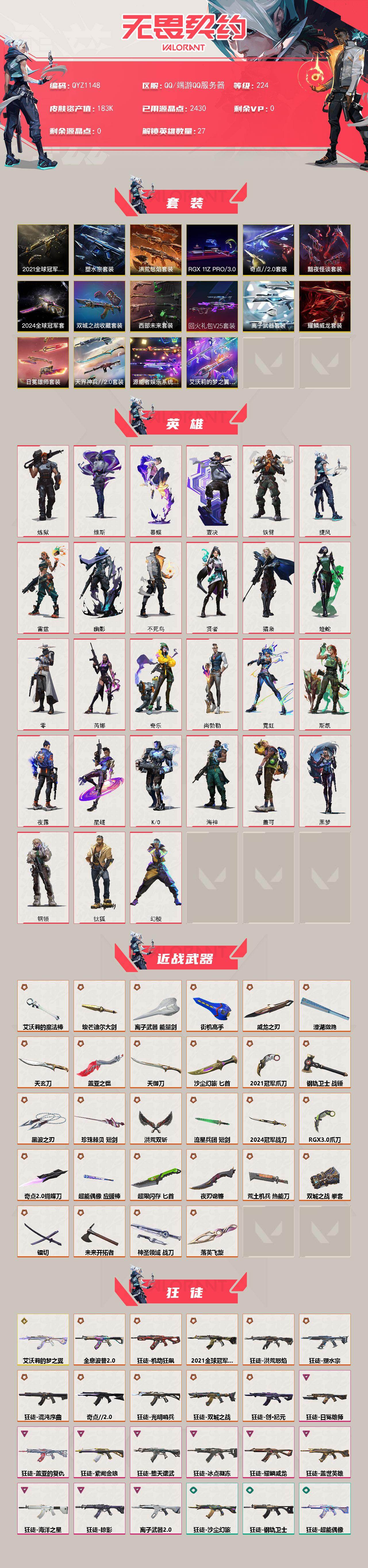 【qyz1148】终极66/传奇10/卓越30/皮肤215/等级224/段位:铂金/2024全球冠军赛套装/2021全球冠军赛套装/源能者娱乐系统套装/艾沃莉的梦之翼套装/回火礼包// v25套装/西部未来套装/rgx 11z pro//3.0套装/塑水宗套装/《双城之战》收藏套装/奇点//2.0套装/黯夜怪谈套装/洪荒怒焰套装/耀鳞威龙套装/离子武器套装/天界神兵//2.0套装/日冕雄师套装/幻棱/炼狱/维斯/暮蝶/钛狐/壹决/铁臂/捷风/雷兹/幽影/不死鸟/贤者/猎枭/蝰蛇/零/芮娜/奇乐/尚勃勒/霓虹/斯凯/夜露/星礈/k/o/海神/盖可/黑梦/钢锁/近战武器-2024全球冠军赛 战刀/近战武器-2021全球冠军赛 爪刀/近战武器-奇点//2.0 蝴蝶刀/近战武器-rgx 11z pro//3.0 爪刀/近战武器-黑波之刃/近战武器-落英飞旋/近战武器-镭切/近战武器-艾沃莉的魔法棒/近战武器-威龙之刃/近战武器-澄湖潋滟/近战武器-双城之战 拳套/近战武器-未来开拓者/近战武器-埃芒迪尔大剑/近战武器-离子武器 能量剑/近战武器-珍珠棘贝 短剑/近战武器-流星兵团 短剑/近战武器-超能偶像 应援棒/近战武器-超限闪存 匕首/近战武器-盖亚之愠/近战武器-钢轨卫士 战锤/近战武器-洪荒双斩/近战武器-荒土机兵 热能刀/近战武器-街机高手/近战武器-沙尘幻旅 匕首/近战武器-天玄刀/近战武器-天御刀/近战武器-夜刃诡镰/近战武器-神圣领域 战刀/狂徒-艾沃莉的梦之翼/狂徒-2021全球冠军赛/狂徒-光明哨兵/狂徒-洪荒怒焰/狂徒-混沌序曲/狂徒-机动狂飙/狂徒-奇点//2.0/狂徒-全息波普//2.0/狂徒-双城之战/狂徒-塑水宗/狂徒-创·纪元/狂徒-冰点凝冻/狂徒-堕天遗武/狂徒-掠影/狂徒-盖世英雄/狂徒-盖亚的复仇/狂徒-海洋之星/狂徒-日冕雄师/狂徒-耀鳞威龙/狂徒-紫阙金琅/狂徒-离子武器//2.0/狂徒-超能偶像/狂徒-钢轨卫士/狂徒-荒土机兵/狂徒-流星兵团/狂徒-沙尘幻旅/狂徒-诡秘蛇影/幻影-781-a协议/幻影-源能者娱乐系统/幻影-2024全球冠军赛/幻影-黯夜怪谈/幻影-洪荒怒焰/幻影-毁灭骑士/幻影-破败军械/幻影-千灵华绽/幻影-西部未来/幻影-般若假面/幻影-离子武器/幻影-天界神兵//2.0/幻影-侦察力量/幻影-超限闪存/幻影-珍珠棘贝/幻影-神圣领域/幻影-聚合之力/幻影-纳米打击/幻影-战术小伙伴/幻影-末日之翼/戍卫-破败军械/戍卫-掠影/戍卫-超能偶像/戍卫-钢轨卫士/戍卫-珍珠棘贝/戍卫-浮光跃金/戍卫-萌彩剪影/戍卫-逆冲蛮牛/戍卫-战术熊与伙伴们/戍卫-月球哨兵/戍卫-折光棱晶/獠犬-781-a协议/獠犬-源能者娱乐系统/獠犬-黯夜怪谈/獠犬-日冕雄师/獠犬-神圣领域/獠犬-采蜜小蜂队/獠犬-复古浪潮/獠犬-胡桃狂想/獠犬-模拟赫兹/獠犬-逆冲蛮牛/獠犬-战术小伙伴/冥驹-源能者娱乐系统/冥驹-千灵华绽/冥驹-全息波普//2.0/冥驹-堕天遗武/冥驹-盖世英雄/冥驹-离子武器/冥驹-荒土机兵/冥驹-复古浪潮/冥驹-胡桃狂想/冥驹-模拟赫兹/冥驹-星云暗涌/飞将-黯夜怪谈/飞将-塑水宗/飞将-西部未来/飞将-沙尘幻旅/飞将-聚合之力/飞将-光导纤维/飞将-战术熊与伙伴们/飞将-末日之翼/莽侠-rgx 11z pro//3.0/莽侠-超限闪存/莽侠-诡秘蛇影/莽侠-深海水族/莽侠-纤云弄巧/莽侠-月球哨兵/战神-奇点/战神-神圣领域/战神-采蜜小蜂队/战神-浮光跃金/战神-萌彩剪影/战神-深海水族/奥丁-艾沃莉的梦之翼/奥丁-全息波普/奥丁-西部未来/奥丁-天界神兵//2.0/奥丁-流星兵团/奥丁-纳米打击/奥丁-战术小伙伴/奥丁-末日之翼/判官-天界神兵//2.0/判官-超能偶像/判官-诡秘蛇影/判官-采蜜小蜂队/判官-萌彩剪影/判官-纳米打击x/雄鹿-离子武器/雄鹿-日冕雄师/雄鹿-紫阙金琅//2.0/雄鹿-复古浪潮/雄鹿-模拟赫兹/雄鹿-逆冲蛮牛/雄鹿-月球哨兵/骇灵-艾沃莉的梦之翼/骇灵-洪荒怒焰/骇灵-塑水宗/骇灵-荒土机兵/骇灵-流星兵团/骇灵-沙尘幻旅/骇灵-珍珠棘贝/骇灵-浮光跃金/骇灵-光导纤维/骇灵-星云暗涌/蜂刺-混沌序曲/蜂刺-超限闪存/蜂刺-胡桃狂想/蜂刺-聚合之力/蜂刺-深海水族/蜂刺-纤云弄巧/蜂刺-战术小伙伴/蜂刺-星云暗涌/蜂刺-折光棱晶/标配-黯夜怪谈/标配-紫阙金琅/标配-超能偶像/标配-荒土机兵/标配-浮光跃金/标配-光导纤维/标配-战术熊与伙伴们/标配-折光棱晶/正义-rgx 11z pro//3.0/正义-千灵华绽/正义-塑水宗/正义-西部未来/正义-离子武器/正义-日冕雄师/正义-超限闪存/正义-沙尘幻旅/正义-复古浪潮/正义-纳米打击/正义-纤云弄巧/正义-月球哨兵/鬼魅-艾沃莉的梦之翼/鬼魅-源能者娱乐系统/鬼魅-奇点//2.0/鬼魅-天界神兵/鬼魅-耀鳞威龙/鬼魅-流星兵团/鬼魅-采蜜小蜂队/鬼魅-光导纤维/鬼魅-胡桃狂想/鬼魅-模拟赫兹/鬼魅-扑棱扑棱/鬼魅-宿怨/鬼魅-星蚀/鬼魅-星云暗涌/狂怒-天界神兵//2.0/狂怒-钢轨卫士/狂怒-珍珠棘贝/狂怒-神圣领域/狂怒-聚合之力/狂怒-萌彩剪影/狂怒-逆冲蛮牛/狂怒-战术熊与伙伴们/短炮-洪荒怒焰/短炮-钢轨卫士/短炮-深海水族/短炮-纤云弄巧/短炮-末日之翼/终章:激斗汉堡 卡面/进入射程 卡面/分崩离析 卡面/纳米打击 卡面/抑制技术 卡面/激斗汉堡 卡面/瓦娃脸雪糕 p2 卡面/从黄昏到黎明 卡面/荒土机兵 卡面/银弹猎手 卡面/逆冲蛮牛 卡面/《双城之战》拥抱 卡面/精灵大战 卡面/欢迎来到底城 卡面/南瓜盛典 卡面/vct cn首冠 卡面/唱片的故事 卡面/钢弓与箭弦 卡面/无畏契约:暮蝶 卡面/排除故障 卡面/奇点//2.0 卡面/战术桌游 卡面/悠享食光 卡面/修车达人 卡面/热舞环节 卡面/模拟赫兹 卡面/浮光跃金 卡面/超限闪存 卡面/维斯工牌 卡