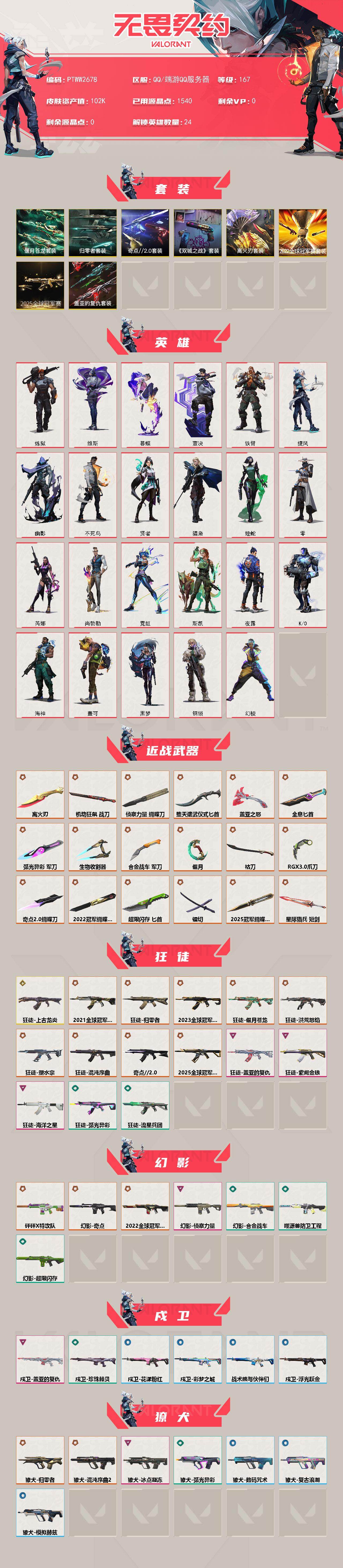 【套装】:2025全球冠军赛套装,2022全球冠军赛套装,离火刃套装,《英雄联盟:双城之战》套装,奇点//2.0套装,归零者套装,偃月苍龙套装,盖亚的复仇套装,离火刃套装 【英雄】:幻棱,炼狱,维斯,暮蝶,壹决,铁臂,捷风,幽影,不死鸟,贤者,猎枭,蝰蛇,零,芮娜,尚勃勒,霓虹,斯凯,夜露,k/o,海神,盖可,黑梦,钢锁 【近战武器】:近战武器-2025全球冠军赛 蝴蝶刀,近战武器-2022全