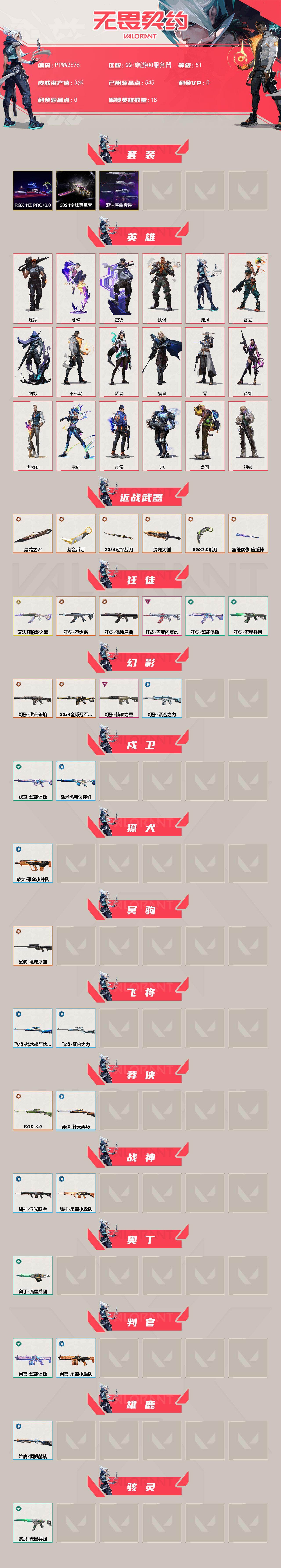 【套装】:2024全球冠军赛套装,rgx 11z pro//3.0套装,混沌序曲套装 【英雄】:炼狱,暮蝶,壹决,铁臂,捷风,雷兹,幽影,不死鸟,贤者,猎枭,零,芮娜,尚勃勒,霓虹,夜露,k/o,盖可,钢锁 【近战武器】:近战武器-2024全球冠军赛 战刀,近战武器-紫金爪刀,近战武器-rgx 11z pro//3.0 爪刀,近战武器-威龙之刃,近战武器-混沌大剑,近战武器-超能偶像 应援棒