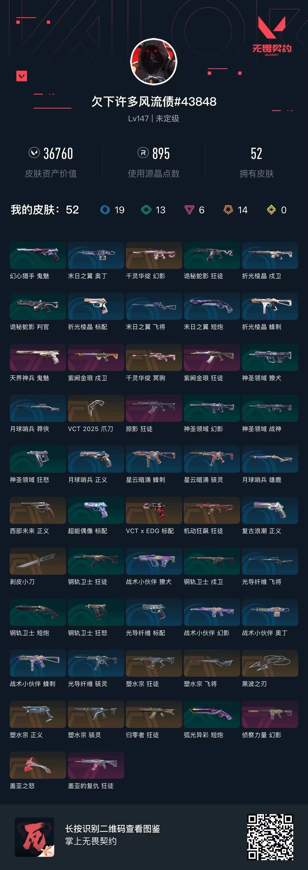 [16584635]14橙皮 6紫皮 52皮肤 28英雄 104卡面 895已用源晶 未定级段位 【套装】vctcn2025套装vct 2025赛季礼包vct 2026队伍礼包塑水宗套装 【近战武器皮肤】vct 2025 爪刀盖亚之怒黑波之刃剥皮小刀 【佩呛皮肤】正义-西部未来正义-塑水宗鬼魅-天界神兵标配-vctxedg 【冲锋呛皮肤】骇灵-塑水宗 【步呛皮肤】狂徒-掠影狂徒-紫阙金琅狂徒-塑水宗狂徒-盖亚的复仇狂徒-归零者狂徒-机动狂飙幻影-侦察力量幻影-千灵华绽戍卫-紫阙金琅 【狙击呛皮肤】飞将-塑水宗冥驹-千灵华绽 【挂饰】春节吉祥结挂饰塑水宗挂饰vct2025太平洋联赛挂饰vct2025美洲联赛挂饰vct2025emea联赛挂饰vct2025cn联赛挂饰袖珍捷风挂饰神中神挂饰永结同心挂饰传世莲华挂饰第九季神话挂饰第八季神话挂饰幸运中国结挂饰冬日絮语挂饰糖葫芦挂饰星荷璀璨挂饰鱼骨头挂饰双城之战小蛋糕挂饰古代传承挂饰vctxedg挂饰